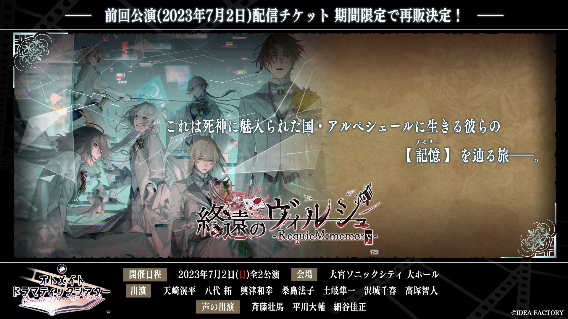 前回公演(2023年7月2日開催 オトメイトドラマティックシアター vol.03「終遠のヴィルシュ -RequieM:memory-」)の配信チケットも期間限定で販売しますので、ぜひ特別なこの機会に「終ヴィル」の世界を隅々までご堪能下さい。