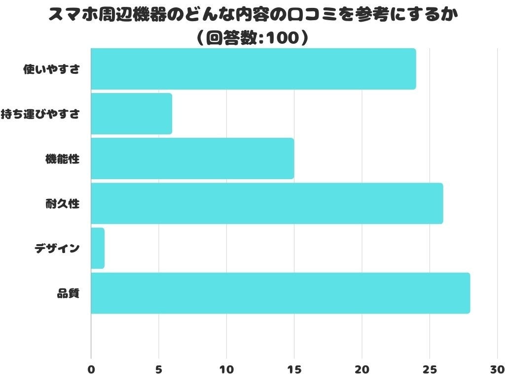 スマホ周辺機器のどんな内容の口コミを参考にするかをアンケートにて調査したところ、1位は「品質」でした。