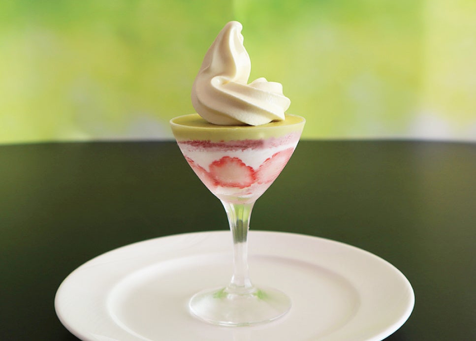 グラスの中には、苺、生クリームとスポンジ生地が入っており、まるで苺ショートのようなパフェです。更にピスタチオのカスタードクリームとソフトクリームを絞り春色をプラス。