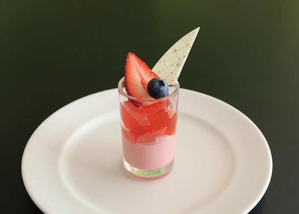 見た目も可愛い“苺のデクリネゾン”の生の苺には和歌山県産「まりひめ」を使用しており、口の中で春の香りを味わうことができます。苺のピスタチオのパフェ、苺タルトや苺のムースリーヌとゼリーのグラスなどのスイーツがワンプレートでお楽しみいただけます。