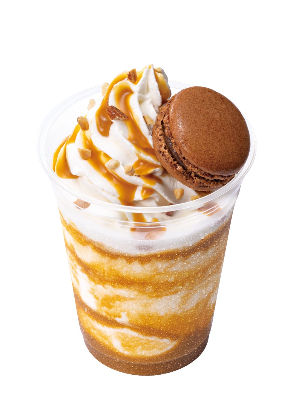 商品概要:ミルクベースのシェーキに塩キャラメルソースを合わせ、なめらかなホイップクリームやクラッシュナッツ、塩キャラメルソース、ショコラマカロンをトッピングしたプチ贅沢なパフェシェーキです。