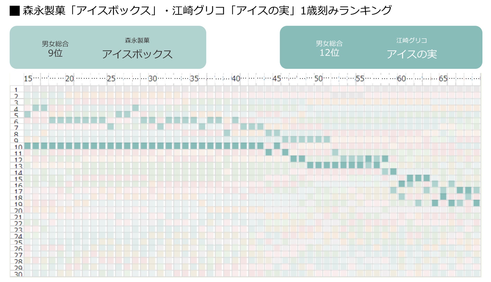 広く親しまれています。2位は比較的低価格な氷菓の定番である赤城乳業「ガリガリ君」、3位は高級アイスクリームのハーゲンダッツ「ミニカップ」と、どれも定番商品ではあるものの、値段や特徴はさまざまです。好みや目的に応じて、購入する商品はどのように変化するのか、ブランドごとに1歳刻みのランキングを読み解きます。