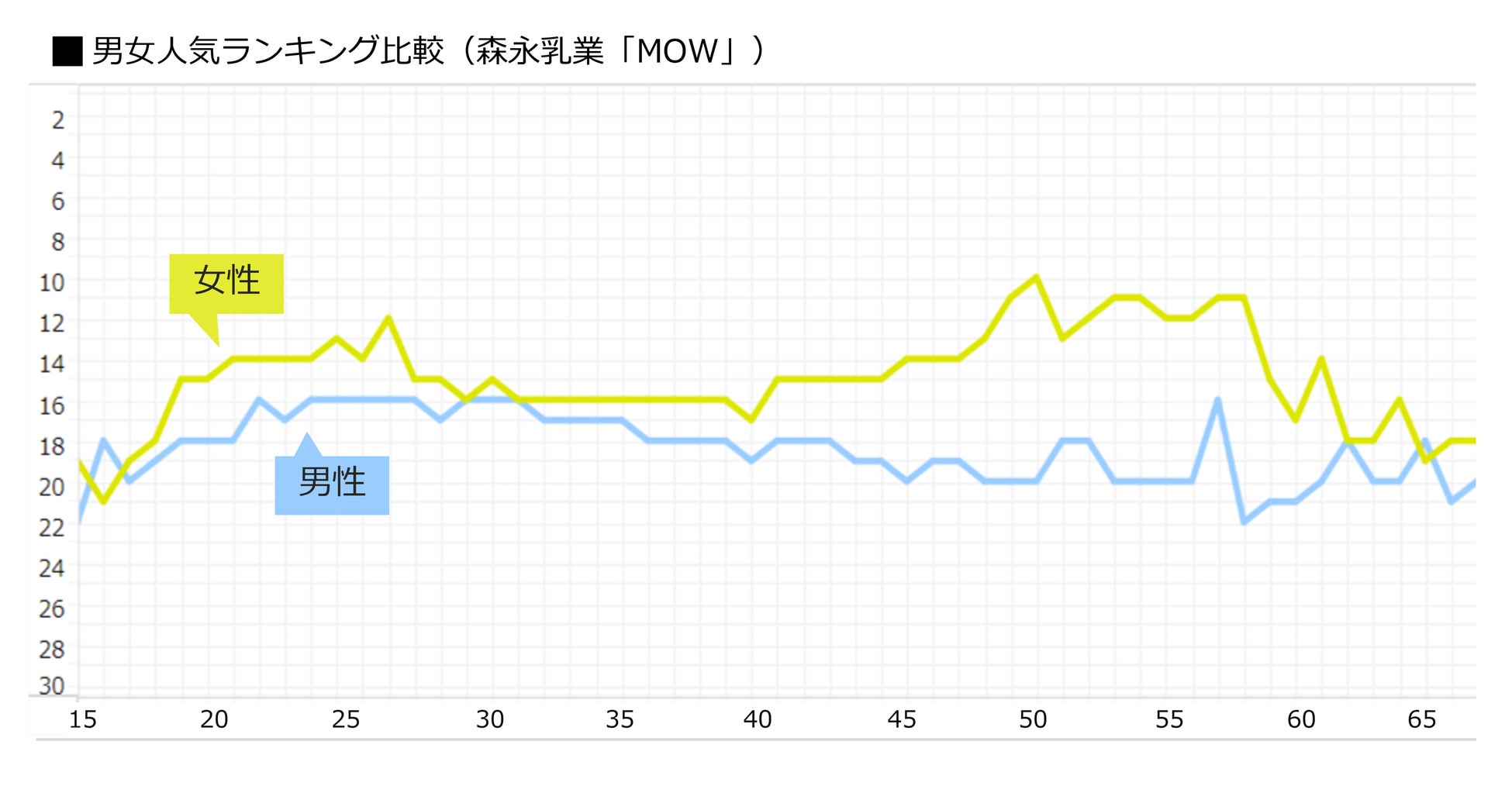 同じ「アイスクリーム※」に分類されるハーゲンダッツ「ミニカップ」も女性2位、男性5位、森永乳業「ピノ」も女性5位、男性9位と女性は比較的濃厚な味わいのアイスクリームを好む傾向があるのかもしれません。