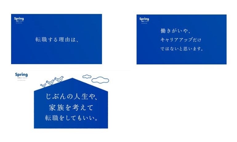 かねてよりSpring転職エージェントでは、ビジョンマッチングを軸とした転職サービスを提供しています。1人の転職コンサルタントが、クライアント企業とキャンディデイト(求職者)を担当する360度式コンサルティング制度により、両者のビジョンをヒアリングした上でのマッチングを図り、クライアント企業とキャンディデイト双方のビジョンマッチングを行っています。そのようななか、ビジョンに寄り添う転職サービスを提供すべく、スキルマッチの延長や仕事におけるやりたいこと、いわゆるキャリアビジョンだけのマッチングだけでなく、人自身の生き方やその家族のことを考えるライフビジョンにも寄り添った転職サービスを提供しています。今回は、そのキャリアのビジョンに寄り添うだけでなく、ライフのビジョンにも寄り添うビジョンマッチングの在り方をコミュニケーションのコンセプトにして、メッセージを開発しました。
