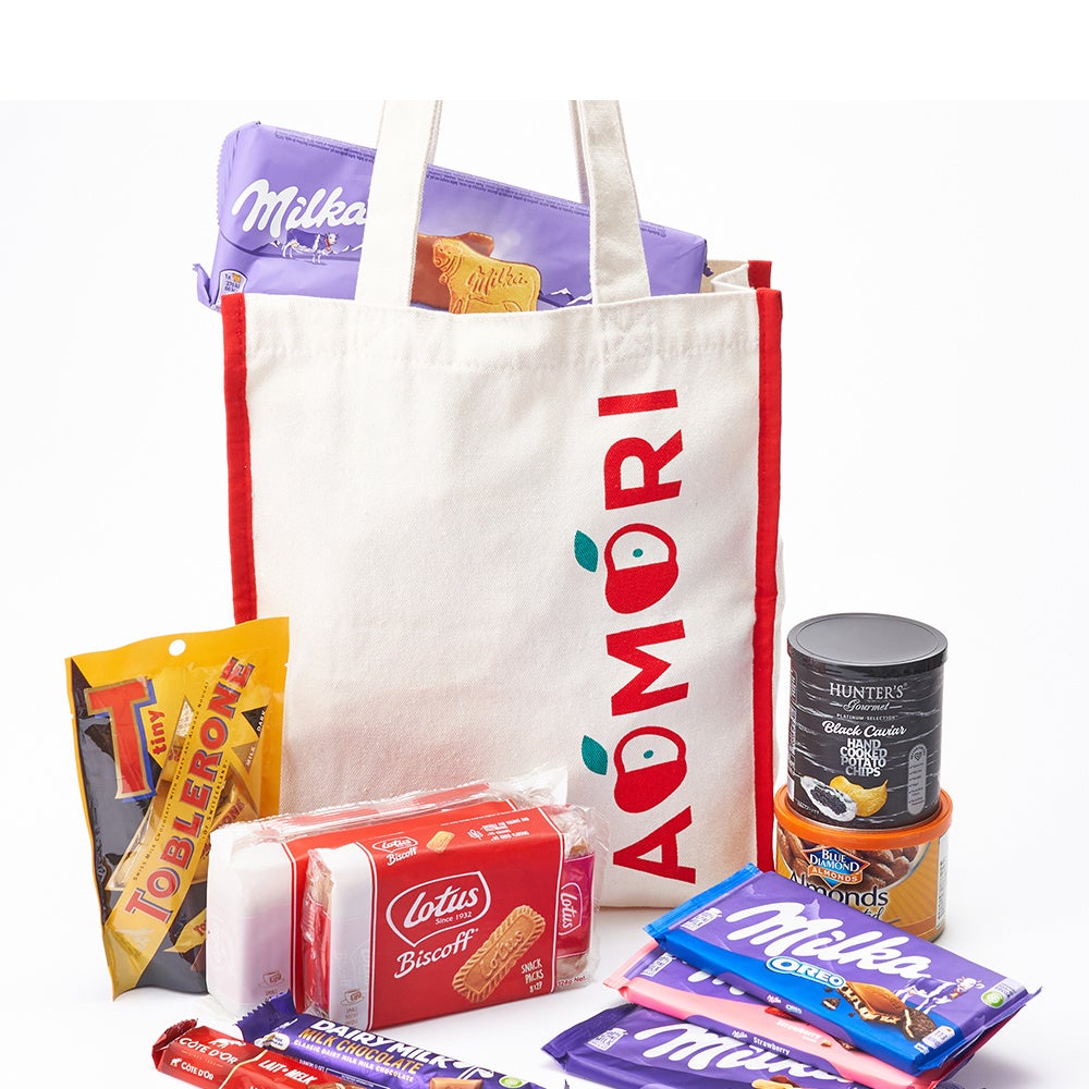 なかでも注目は、ここでしか手に入らない「AOMORI POP-UP STORE限定 HAPPY BAG」!PLAZAで大人気のお菓子計11点が、「AOMORI」とデザインされたオリジナルトートバッグに入ったスペシャルなセットです。