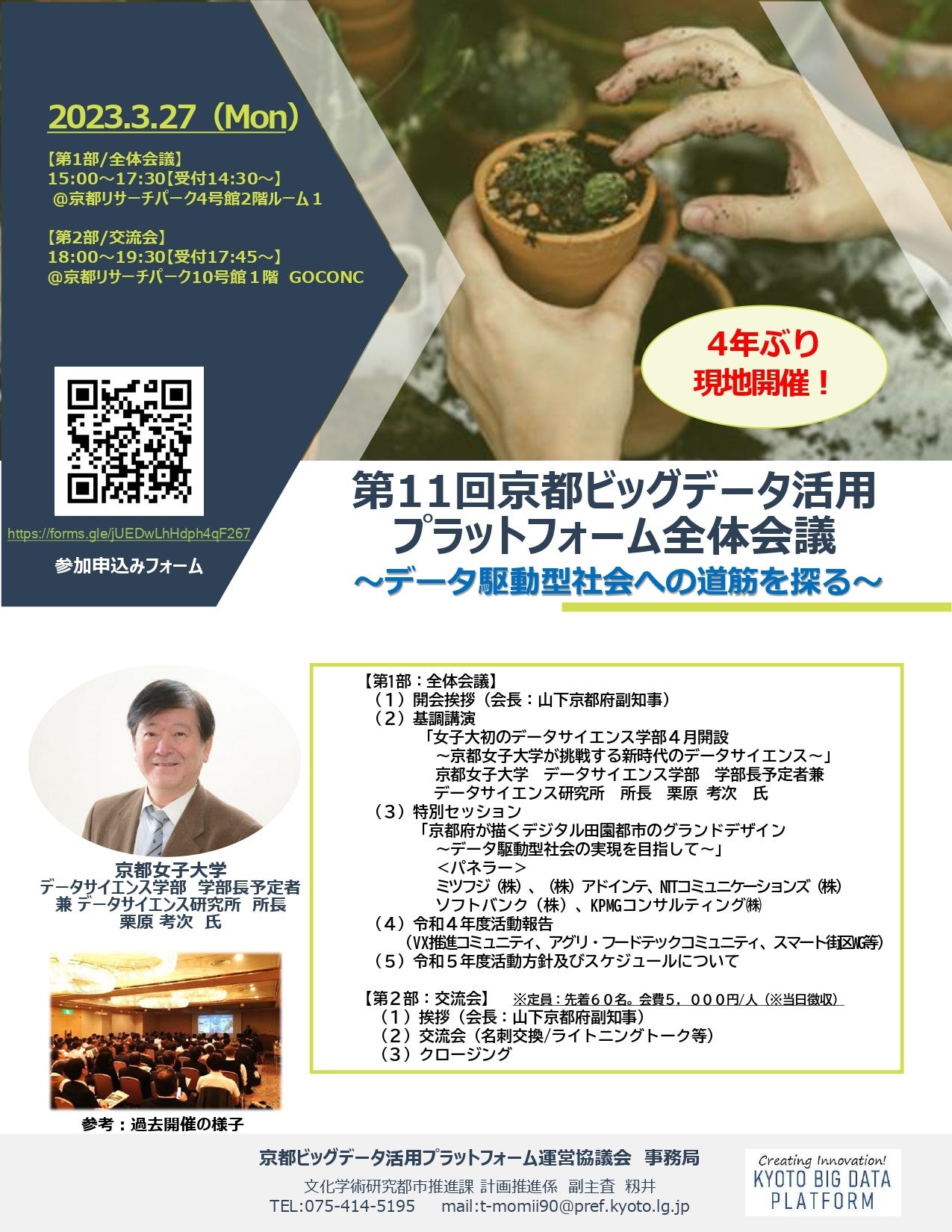 『住んでよし、訪れてよし』の超快適スマート社会の創出を目指す京都ビッグデータ活用プラットフォームの第11回全体会議を約4年ぶりに現地開催します。今回は、京都女子大学 データサイエンス学部 学部長(予定者)兼データサイエンス研究所 所長 栗原考次様に基調講演いただくとともに、本プラットフォームの令和4年度活動報告等を行います。データ活用について、一緒に考えませんか? 是非、ご参加ください。