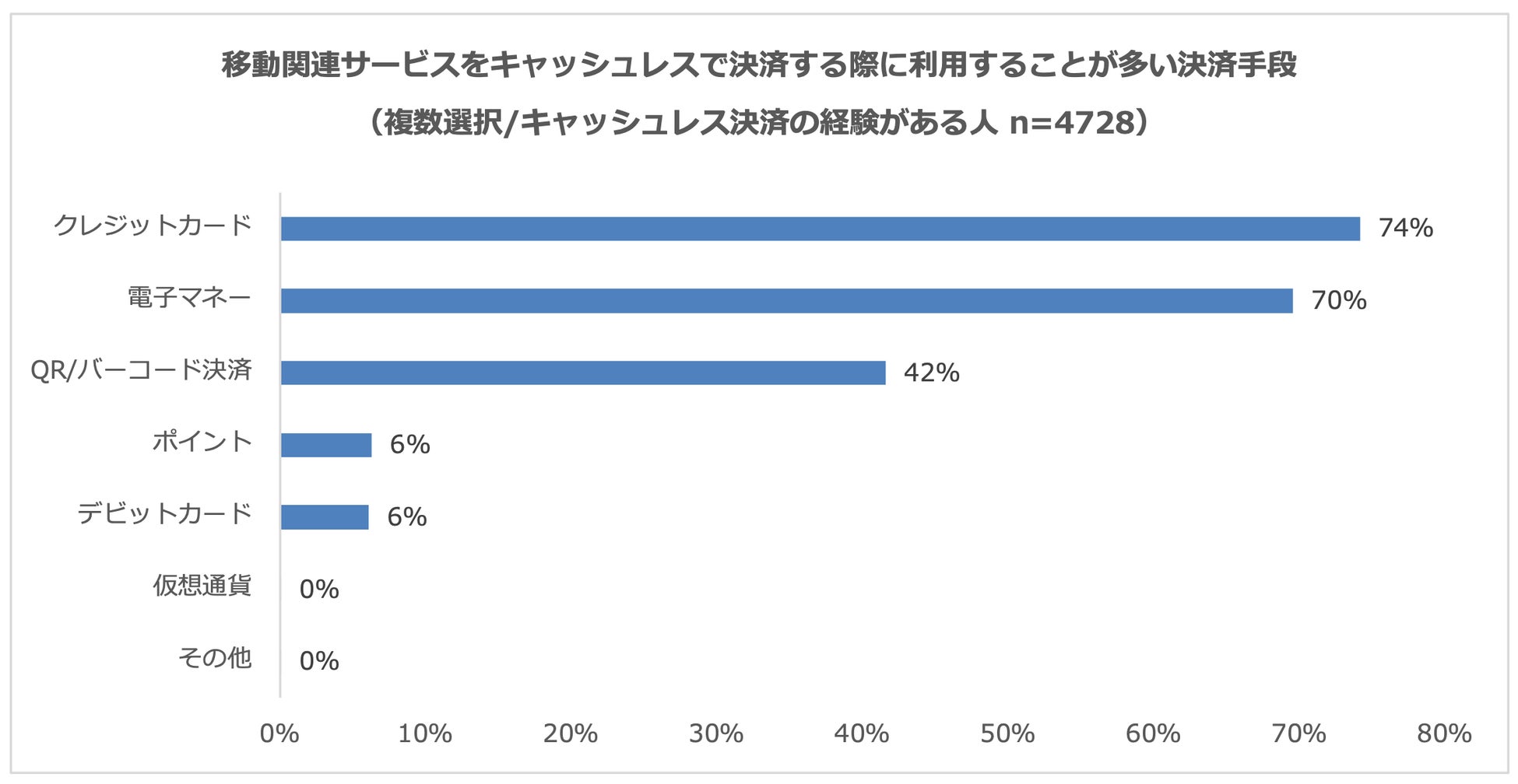 移動関連サービス利用時のキャッシュレス決済の手段としては、「クレジットカード」が74%で最も多く、次いで「電子マネー※1」70%、「QR※2/バーコード決済」42%となりました。