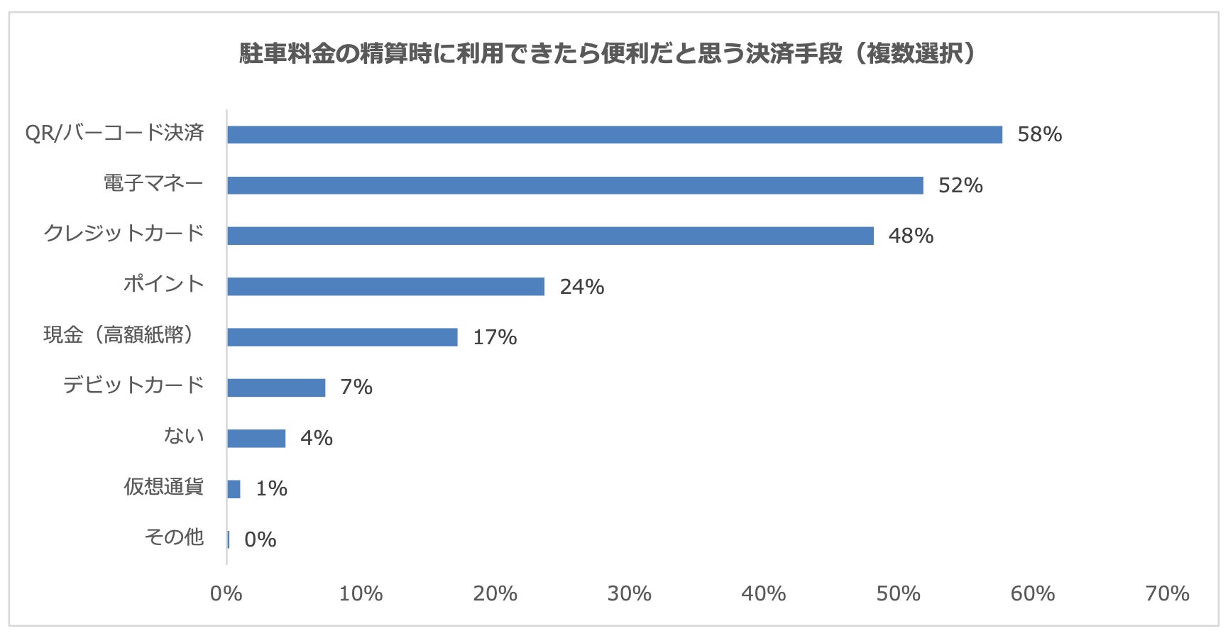 現金決済比率が高い「駐車場」で、駐車料金の精算時に利用できたら便利だと思う決済手段は、「QR/バーコード決済」が58%で最も多く、続いて「電子マネー」52%、「クレジットカード」48%となりました。