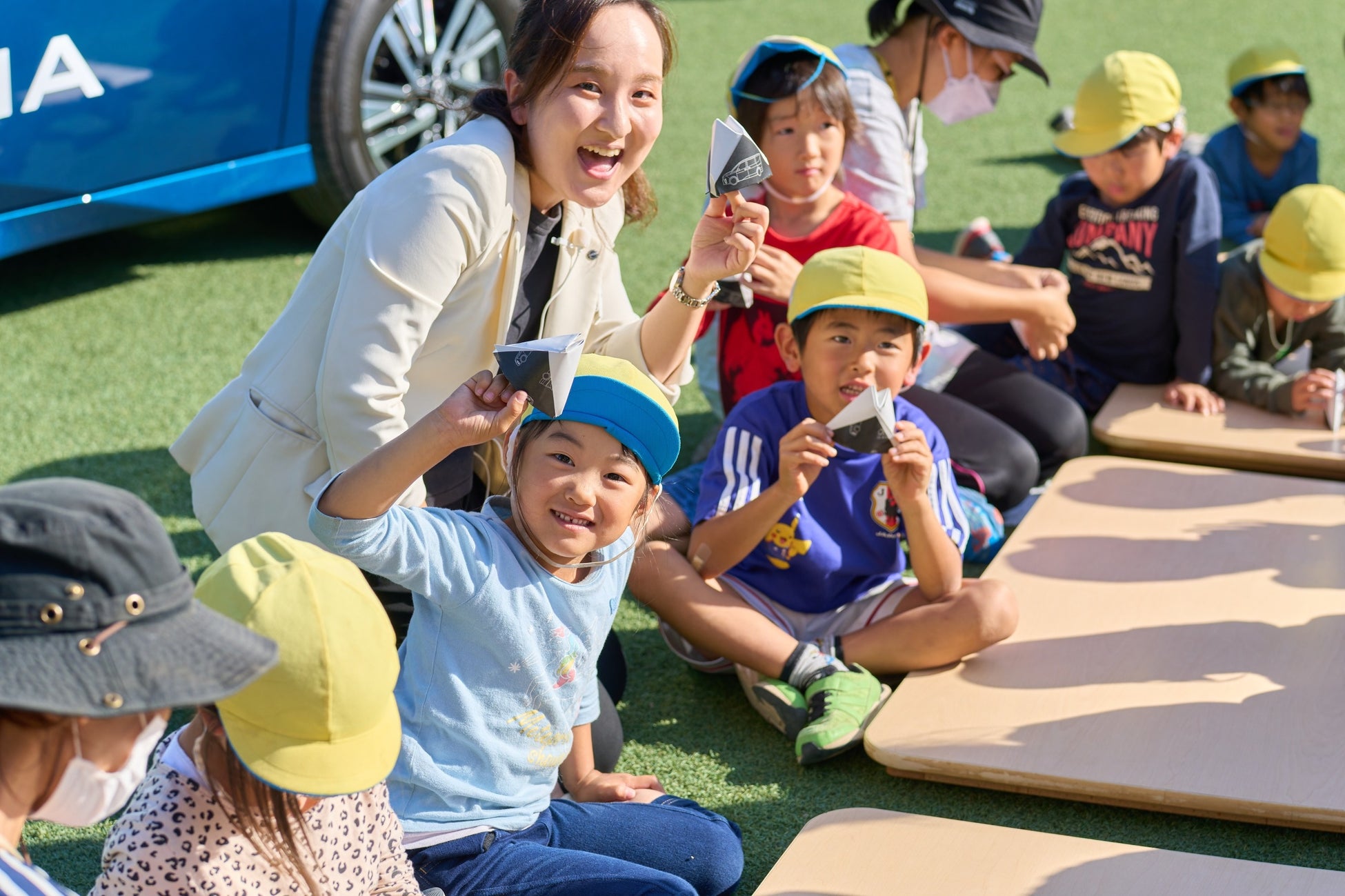 イベントでは、「日産セレナおにぎりアクション号」が子どもたちを園庭でお出迎え。まず最初に、車の前で紙芝居の読み聞かせが行われました。紙芝居のタイトルは「ピクニックでおにぎりアクション!〜おにぎりで世界を救おう〜」。主人公の女の子がピクニックに持っていくおにぎりをお母さんと作りながら、日々の美味しいごはんはたくさんの人の頑張りのおかげで食べることができることや、世界には美味しいご飯を満足に食べられない人もいること、またそのような人に食べ物を届ける「おにぎりアクション」という取り組みがあることを学びました。