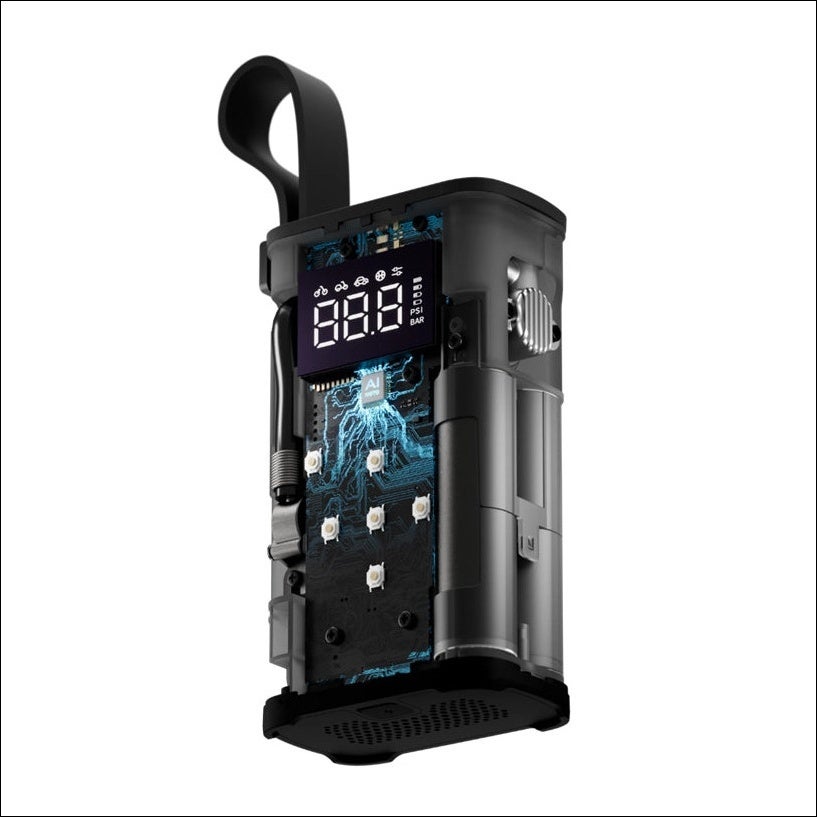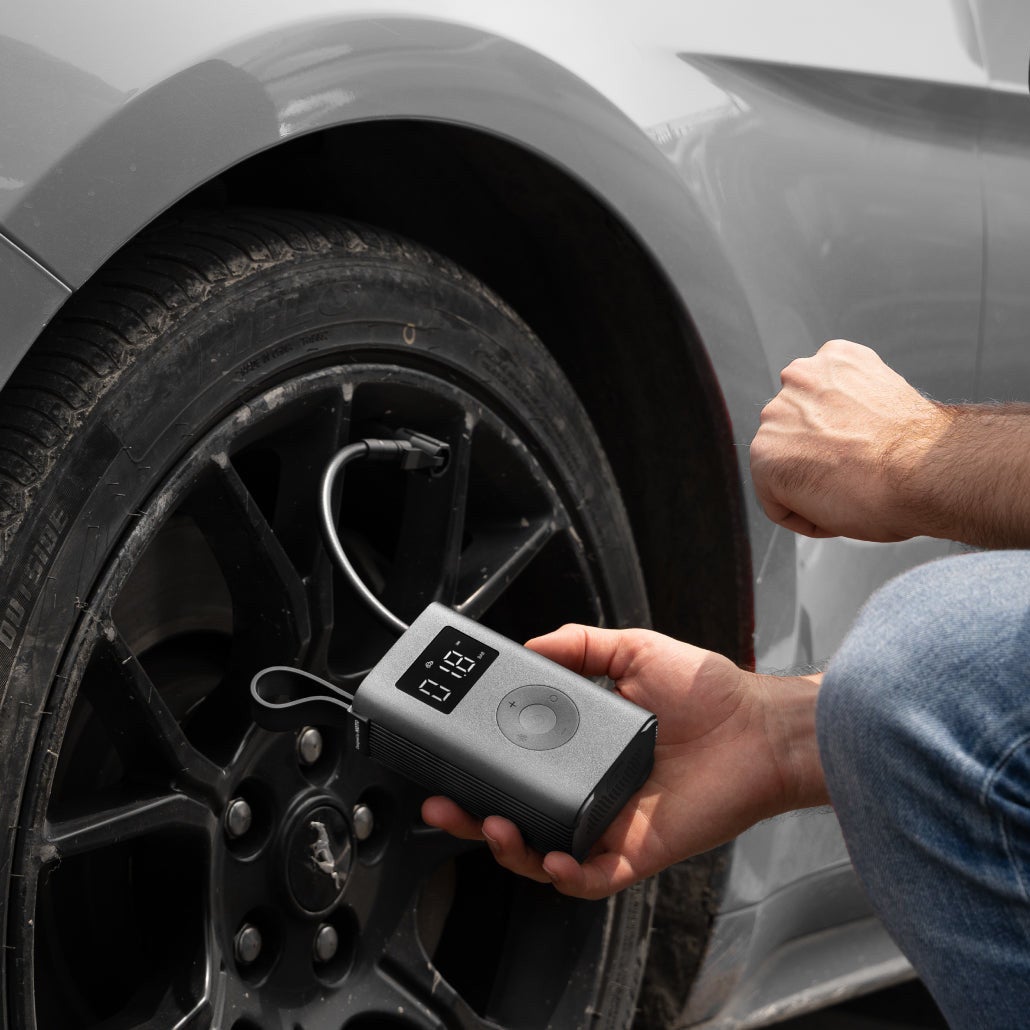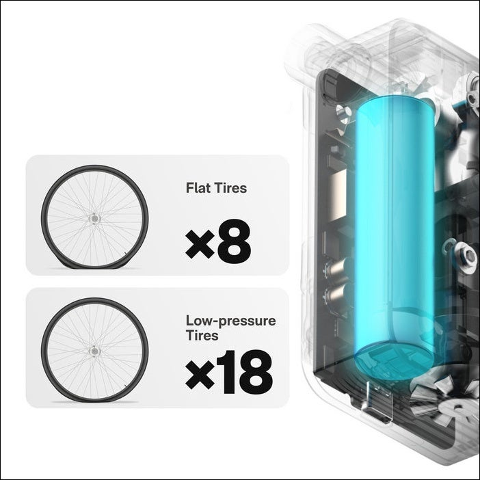 2,000mAhのリチウムイオンバッテリーを内蔵しています。最大8本の完全に空気が抜けた自転車のタイヤを膨らますことができ、空気圧が下がったタイヤなら18 本に空気を入れることができます。