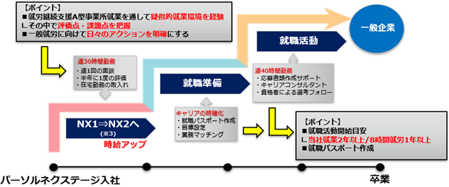 パーソルネクステージでは、クルー(利用者の方)(※1)を一般就労に向けてサポートしていくために、一般就労に近い就労環境を整えております。