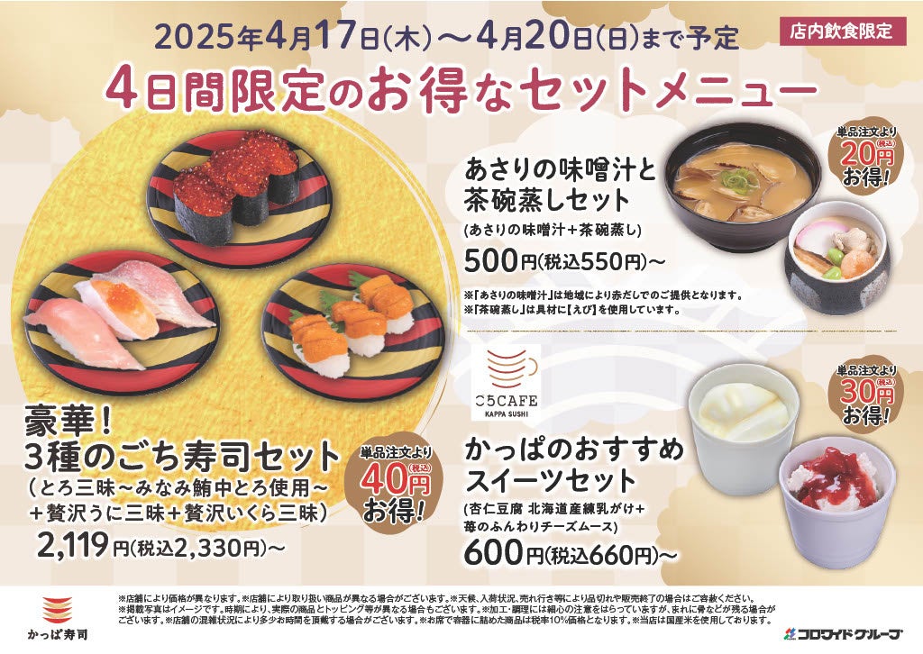 2025年4月17日(木)から20日(日)の4日間、『豪華!3種のごち寿司セット』・『あさりの味噌汁と茶碗蒸しセット』・『かっぱのおすすめスイーツセット』を提供します。みなみ鮪中とろを使用したとろ三昧や贅沢なうに、いくらを使用した豪華ごち寿司セットや、『杏仁豆腐 北海道産練乳がけ』と『苺のふんわりチーズムース』のスイーツセットをお楽しみください。