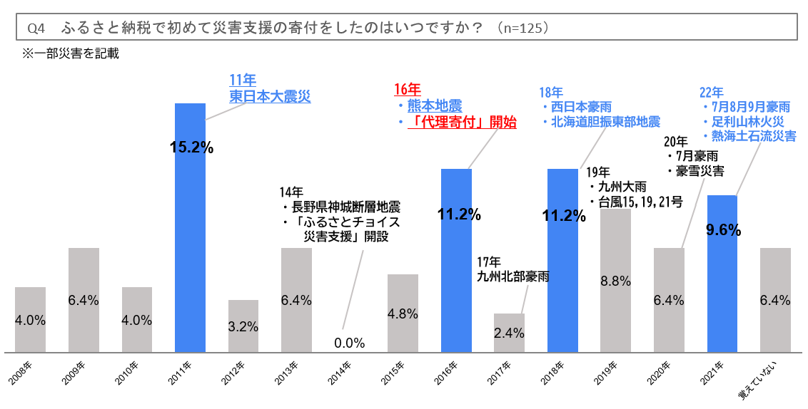 ふるさと納税で初めて災害支援寄付をしたのは「東日本大震災があった2011年」が最多◇「代理寄付」を知っている人の約7割が、「代理寄付をした」との結果に