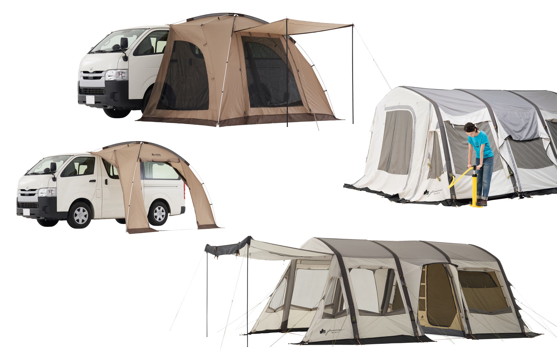 なかでも、大型のミニバンにも取り付け可能で車中泊が広々快適に過ごせる「Tradcanvas ハイタイプカーサイドオーニング」や、空気を入れるだけの簡単設営な家族6人用エアテント「グランベーシック エアマジック リビングハウス WXL-AI」は秋のオートキャンプやファミリーキャンプにぴったり!