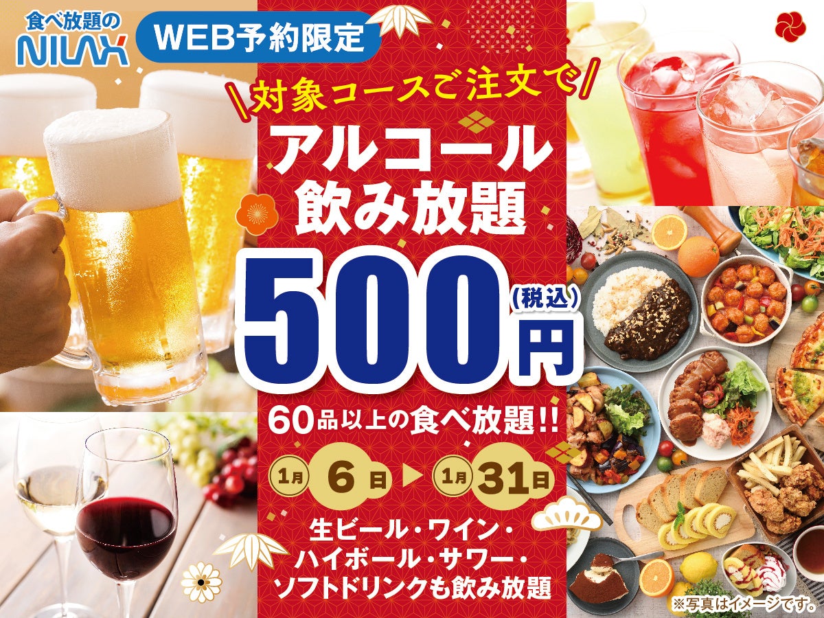 この度、『ニラックスブッフェ』40店舗にて、2025年1月6日(月)~1月31日(金)まで、WEB予約限定『アルコール飲み放題が税込500円』でお楽しみ頂けるプランが登場いたしました!