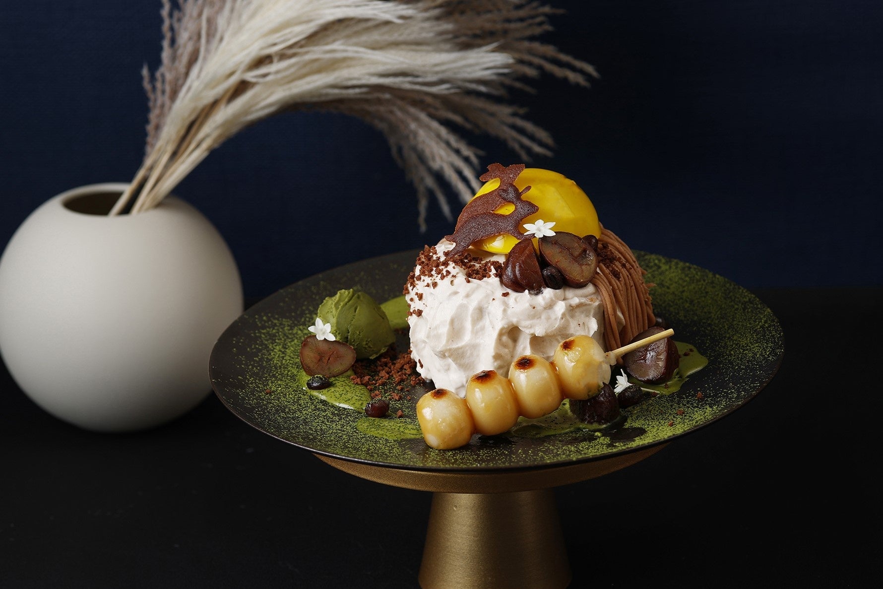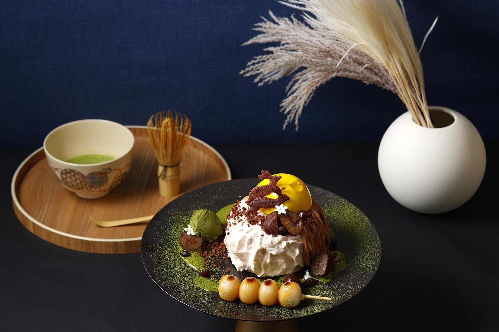 秋の風物詩「お月見」と、芳醇な味わいの「栗」をかけ合わせたパンケーキは、 “月が昇る山並み”を表現いたしました。栗の風味豊かなスフレ生地の間にはカスタードクリームを挟み、トップには香ばしい焼き栗風味のマロンシャンティと、なめらかな洋栗のモンブランを半分ずつ重ねました。さらに、満月に見立てたみたらしムース、月に映るうさぎ型のココアチュイール、和栗をのせ、幻想的な秋の夜を演出。サイドには、みたらし団子と抹茶のシャンティ、抹茶アイスクリームを添え、お月見の情景を一層引き立てます。栗の奥深い甘みと、みたらしのやさしい塩味が調和する、秋だけの贅沢な味わいをご堪能いただけます。さらに、厳選した抹茶を目の前で点てて提供するオプションもご用意いたします。