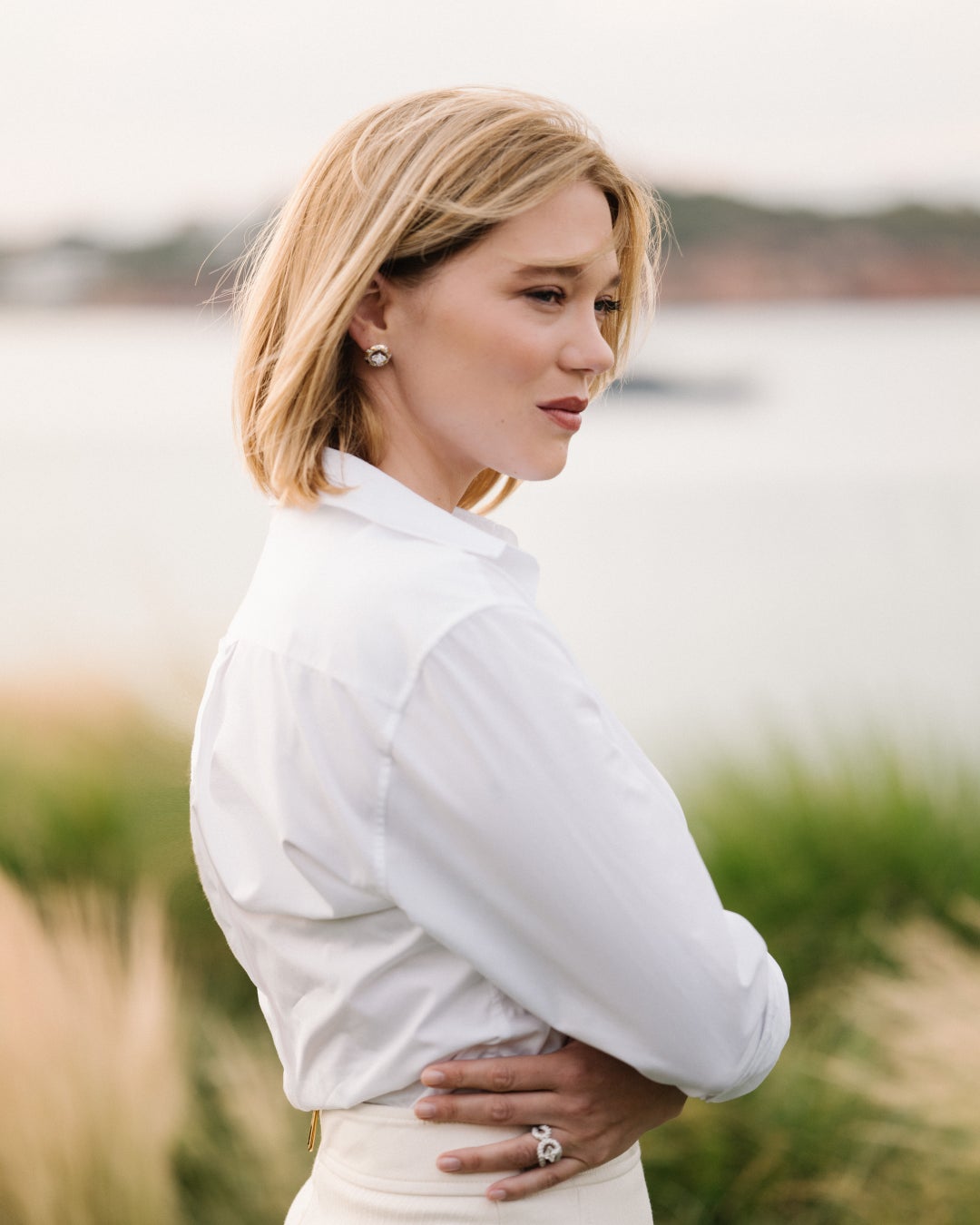 ルイ・ヴィトンのハイジュエリー コレクションから、ホワイトゴールドにダイヤモンドをあしらったネックレスとリング、ホワイトゴールドとイエローゴールドにダイヤモンドを組み合わせたイヤリングを着用。ホワイトシャツにクリームカラーのミディアム丈スカートとプラックパンプスをコーディネート。