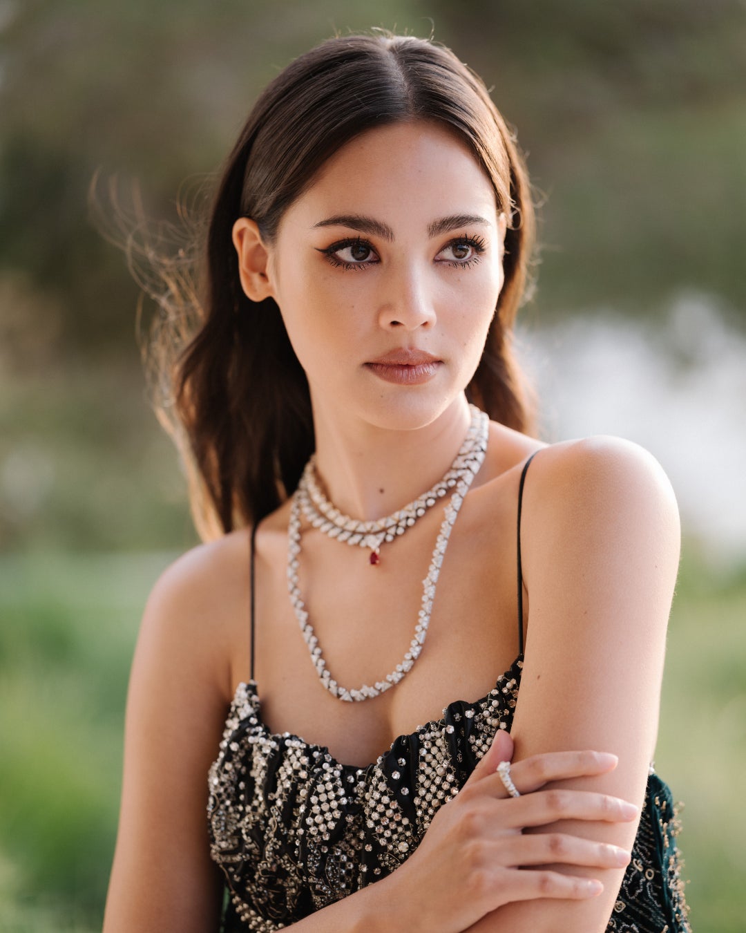 ルイ・ヴィトンのハイジュエリー コレクションから、ホワイトゴールドとローズゴールドにルビーとダイヤモンドをセッティングしたネックレス、ホワイトゴールドにダイヤモンドをあしらったリングをコーディネート。ブラックとシルバーの刺繍が美しいドレスにプティット・マルとブラックサンダルを合わせて。