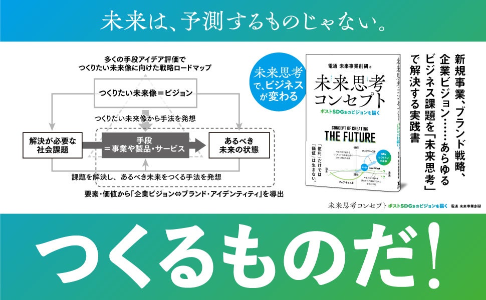 ビジネス書や実用書を中心に出版する株式会社クロスメディア・パブリッシング(本社:東京都渋谷区、代表取締役社長:小早川幸一郎)は、2025年6月27日に書籍『未来思考コンセプト―ポストSDGsのビジョンを描く』を刊行します。本書は電通グループ横断組織「電通 未来事業創研」が開発した、企業の未来価値創造メソッドを初めて体系化した実践書です。「未来は予測するものではなく、つくり出すもの」という考えのもと、2030年以降のポストSDGs時代に求められる「量的成長から質的成長への転換」を実現するための具体的手法を提示しています。