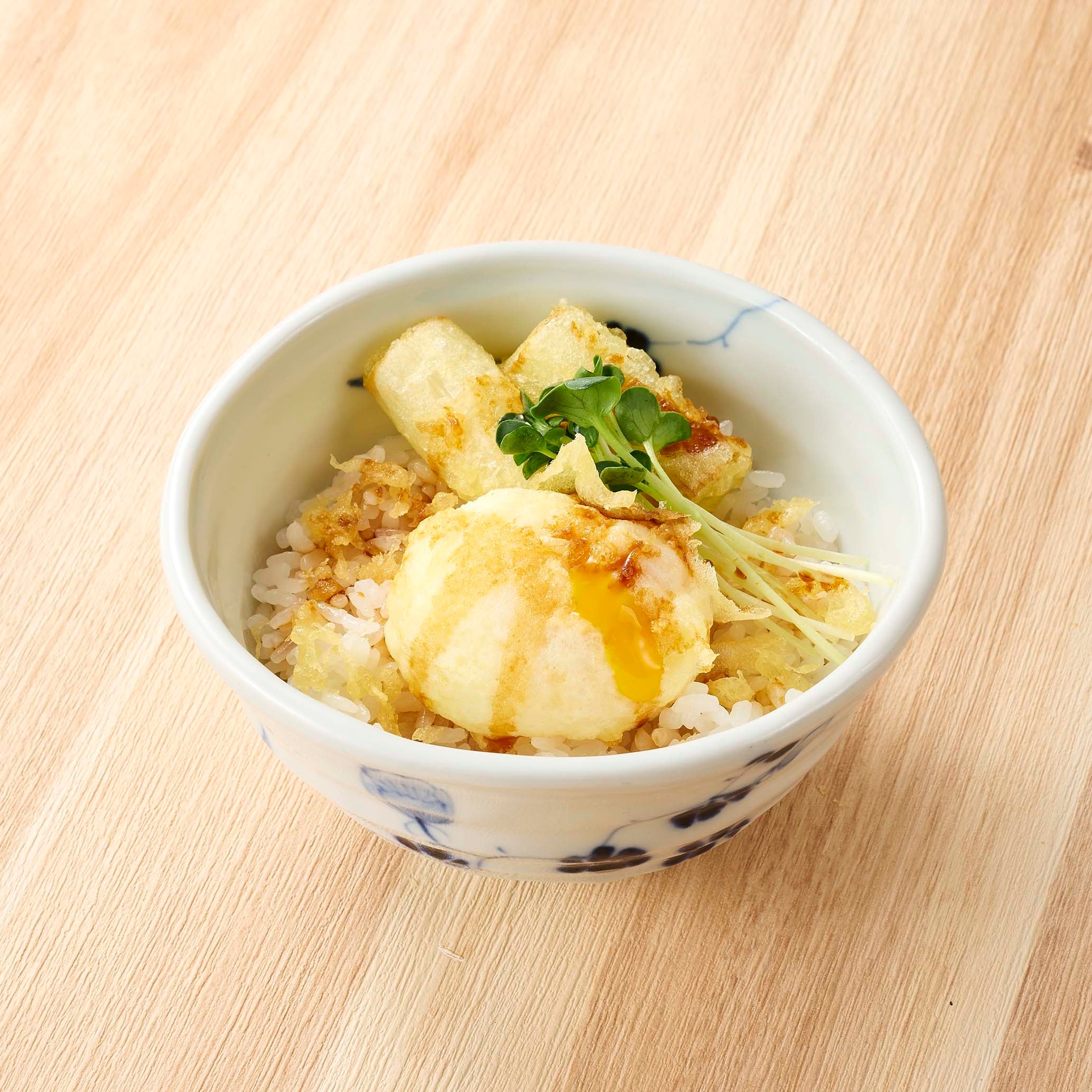 揚げ玉の無料トッピングサービスを行います。揚げ玉を少しおそばに浮かべると、コクが増し、満足感アップは間違いありません。お好みでトッピングができるよう、セルフサービスでのご提供です。