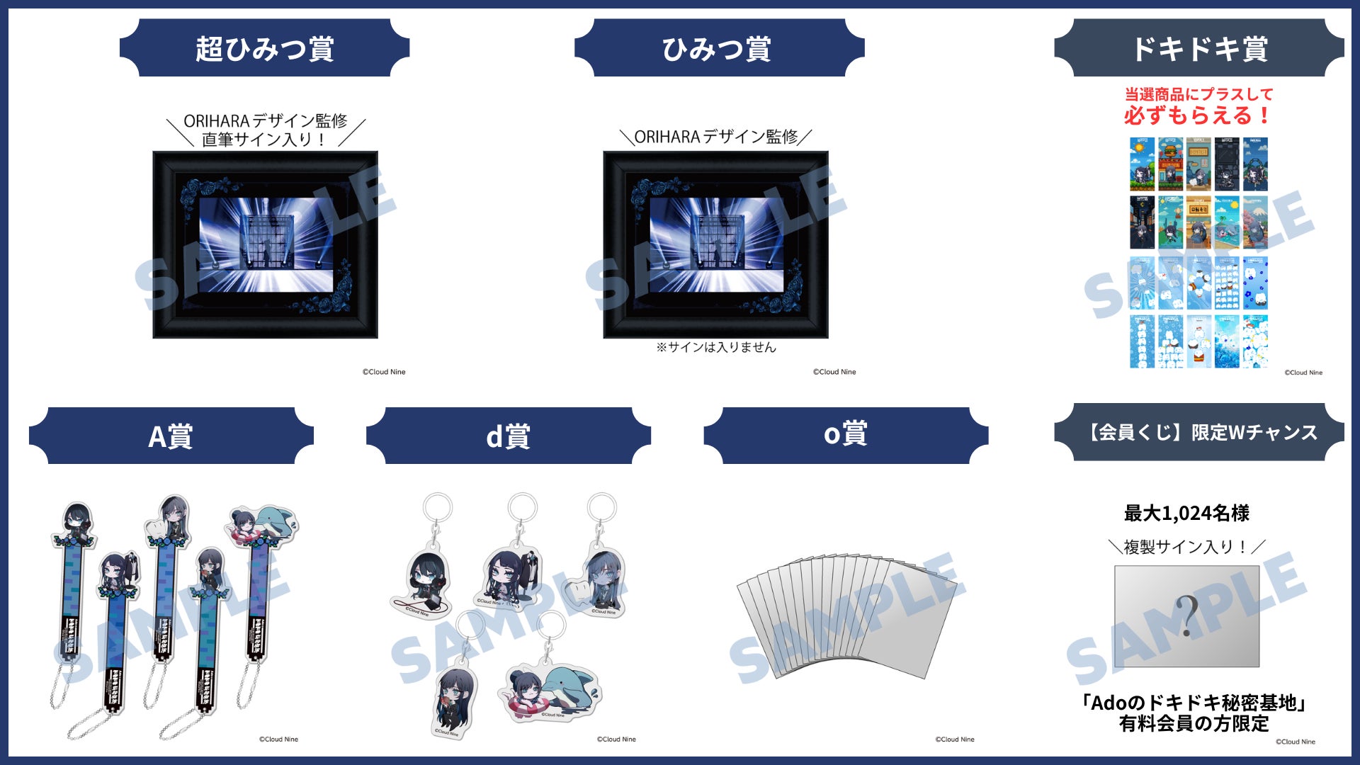 「ひみつ賞」では、ORIHARA監修による額入りライブフォトパネル(サインなし)が用意されています。加えて、同フォトパネルにAdoの直筆サイン(購入者のフルネーム入り)が入った「超ひみつ賞」もラインナップ。A賞はミニキャラクターをデザインしたアクリルフォトプロップス、d賞は同キャラクターのアンブレラマーカー、o賞はライブ写真です。さらに、購入者は、くじを1回引くごとに購入特典として「ドキドキ賞」を1枚必ず受け取ることができます。「ドキドキ賞」では、Adoが作画したキャラクター「はちゃん」の世界観をさまざまな形で楽しめるモバイル壁紙(全20種のうち1枚をランダム)を入手できます。また、ファンサイト有料会員向けの「会員くじ」を購入した方の中から抽選で、Wチャンス賞として最大1024名にAdoの複製サイン入りのアザーカットライブ写真が当たります。