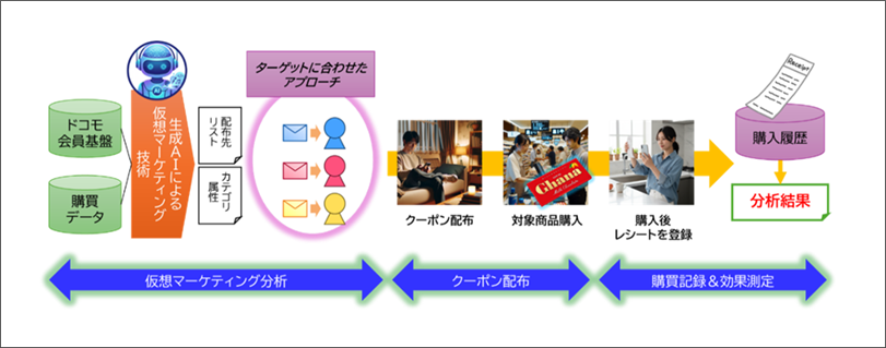 株式会社ロッテ(以下、ロッテ)と株式会社NTTドコモ(以下、ドコモ)はドコモが開発した、企業が保有する各種データを活用して大規模言語モデルにより仮想的な消費者モデル像(※1)(以下、仮想顧客)を生成し、仮想顧客へヒアリングを行える仮想マーケティング技術(※2)(以下、仮想マーケティング技術)とドコモが保有する約1億(※3)のdアカウント会員のデータおよび購買データを活用した、クーポン配信におけるターゲティングの実証実験(以下、本実証)を実施し、本実証の結果を確認できましたので本日発表いたします。なお、仮想マーケティング技術で、広告やクーポンの配信におけるターゲティングの実証実験を行ったのは今回が初めてです。