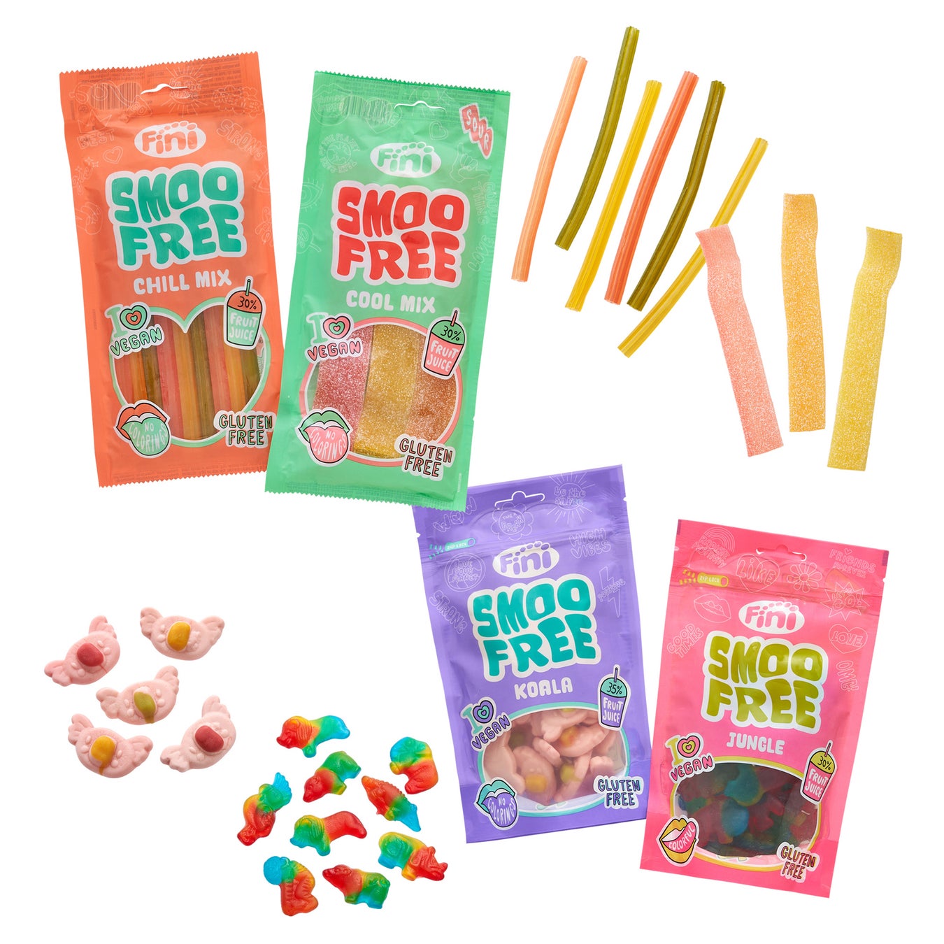 FINI SMOOFREE 左から ストローグミ、サワーベルトグミ、コアラ、ジャングル 各388円
