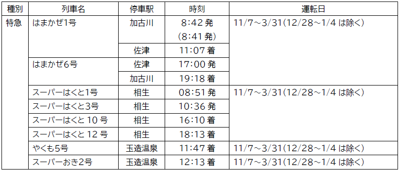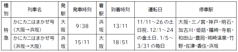 ・臨時列車「かにカニはまかぜ号(全車指定席)」の運行や、一部特急列車の臨時停車をいたします。