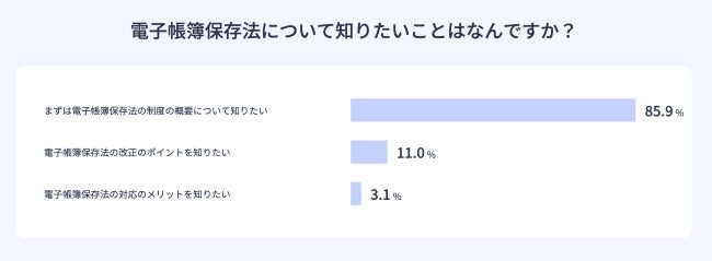 | ■調査結果トピックス ・電子帳簿保存法の改正内容について、7割以上がよく知らないと回答。 ・6割の回答者が自社の対応について悩んでいる。 ・まずは電子帳簿保存法の概要について知りたいというニーズが大きい。 |