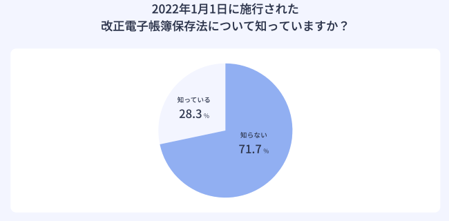 「2022年1月1日に施行された改正電子帳簿保存法について知っていますか?」という質問に対して、「知っている」と答えた回答者は28.3%、「知らない」と答えた回答者は71.7%という結果になりました。改正電子帳簿保存法の認知度については、まだまだ大きな課題がありそうです。