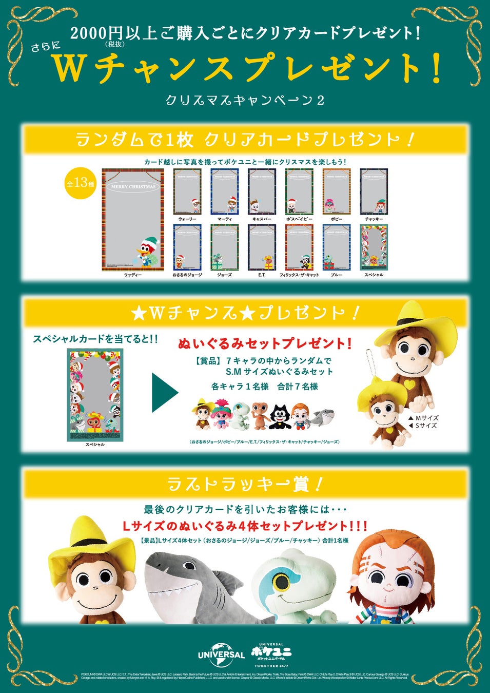 税抜き2,000円以上お買い上げごとに1枚、ポケユニキャラクターたちといっしょに写真が撮れるクリアカードをプレゼント!クリアカードがなんとくじになっています。当たりは12キャラクターの絵柄となっており、ぬいぐるみS/Mサイズがキャラクターランダムでその場で当たります。最後のご当選の方はさらにLサイズのぬいぐるみ4キャラクターがセットで当たります。