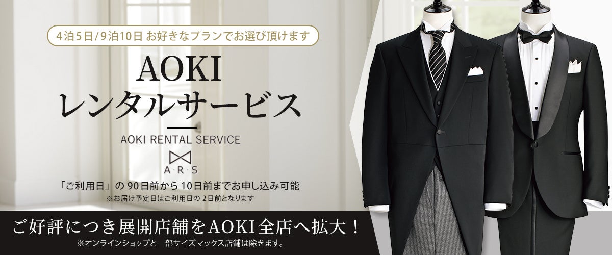 そして、昨今のブライダル・式典回帰による礼装需要の高まりも重なり、AOKIでのモーニングコート・タキシードの販売・レンタル売上高は過去最高(直近10年)と好調に推移していることを受け、この度『AOKIレンタルサービス(A・R・S)』をAOKI全店へと展開いたします。