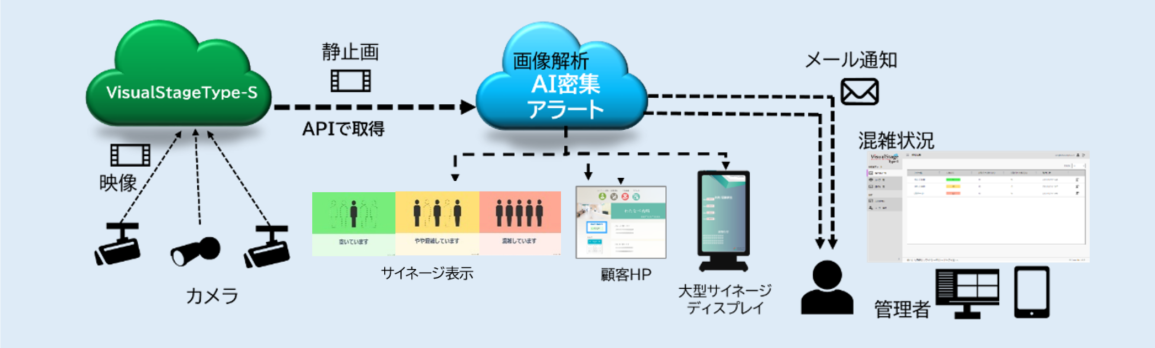 1.ネットワークカメラの映像を解析した混雑状況を、メール・サイネージ・ホームページなど用途に応じて表示