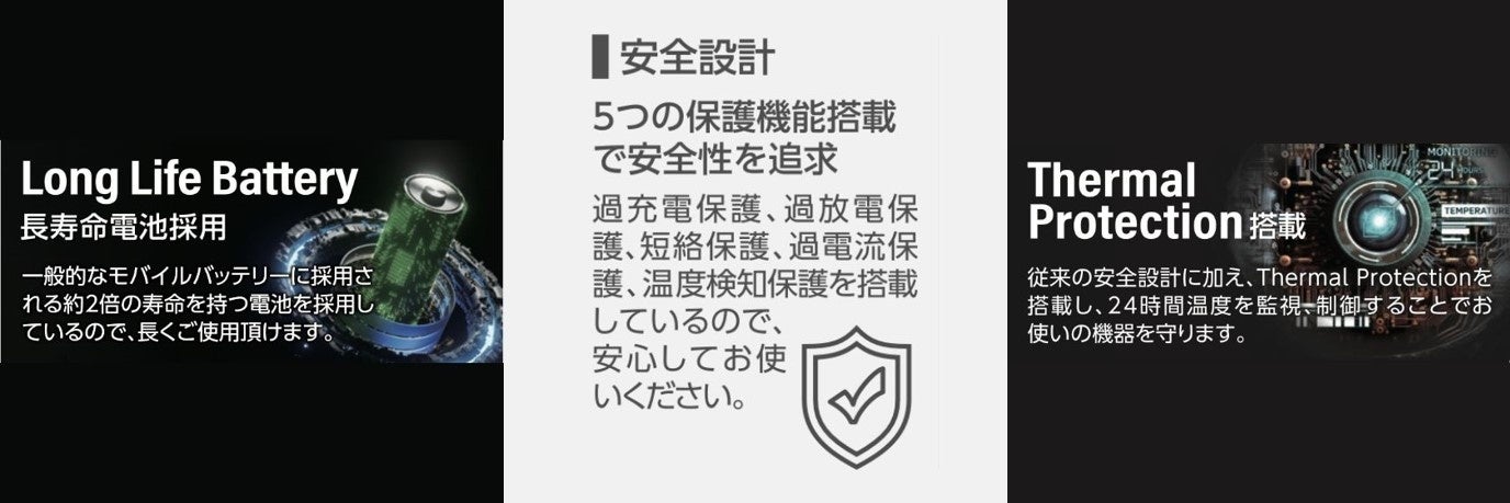 ■一般的なモバイルバッテリーに搭載されるものの約2倍の寿命を持つ電池を採用しています。