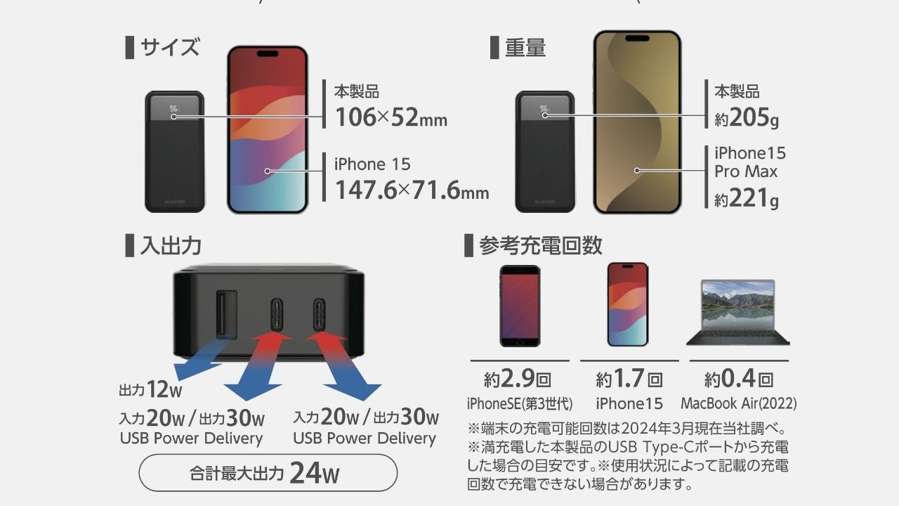 ※満充電した本製品で電源オフの状態のスマートフォンを充電する際の目安回数です。充電中に電源を入れたり、機器を使用したりしている場合は記載の数値まで充電できない場合があります。