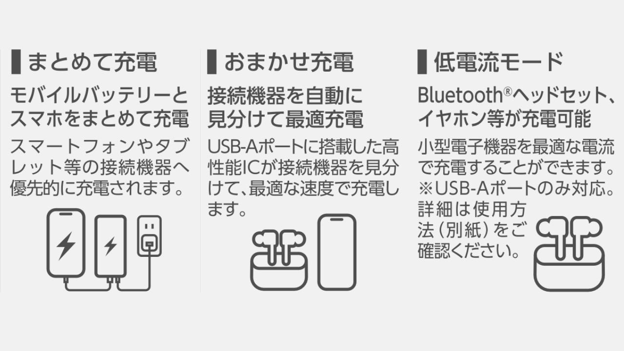 ■Bluetooth(R) ヘッドセット・イヤホンなどの充電電流の小さい小型電子機器を最適な電流で充電することができる低電流モードを搭載しています。 ※USB-Aポートのみ