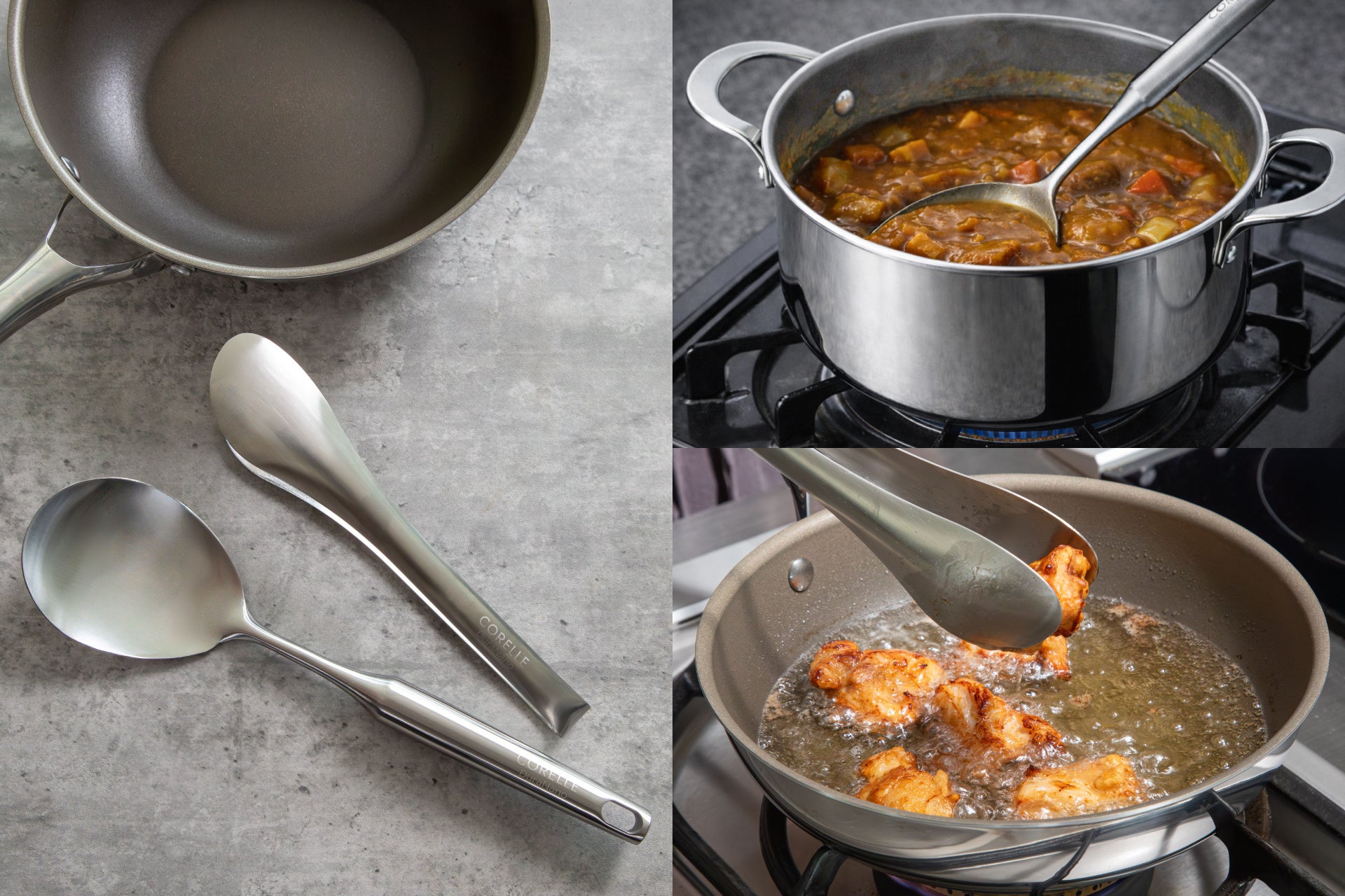 累計販売枚数15万枚を突破したキッチンブランド『CORELLE(コレール)』よりフライパンと世界観を統一したキッチンツール「万能調理スプーン&トング」2点セットを発売