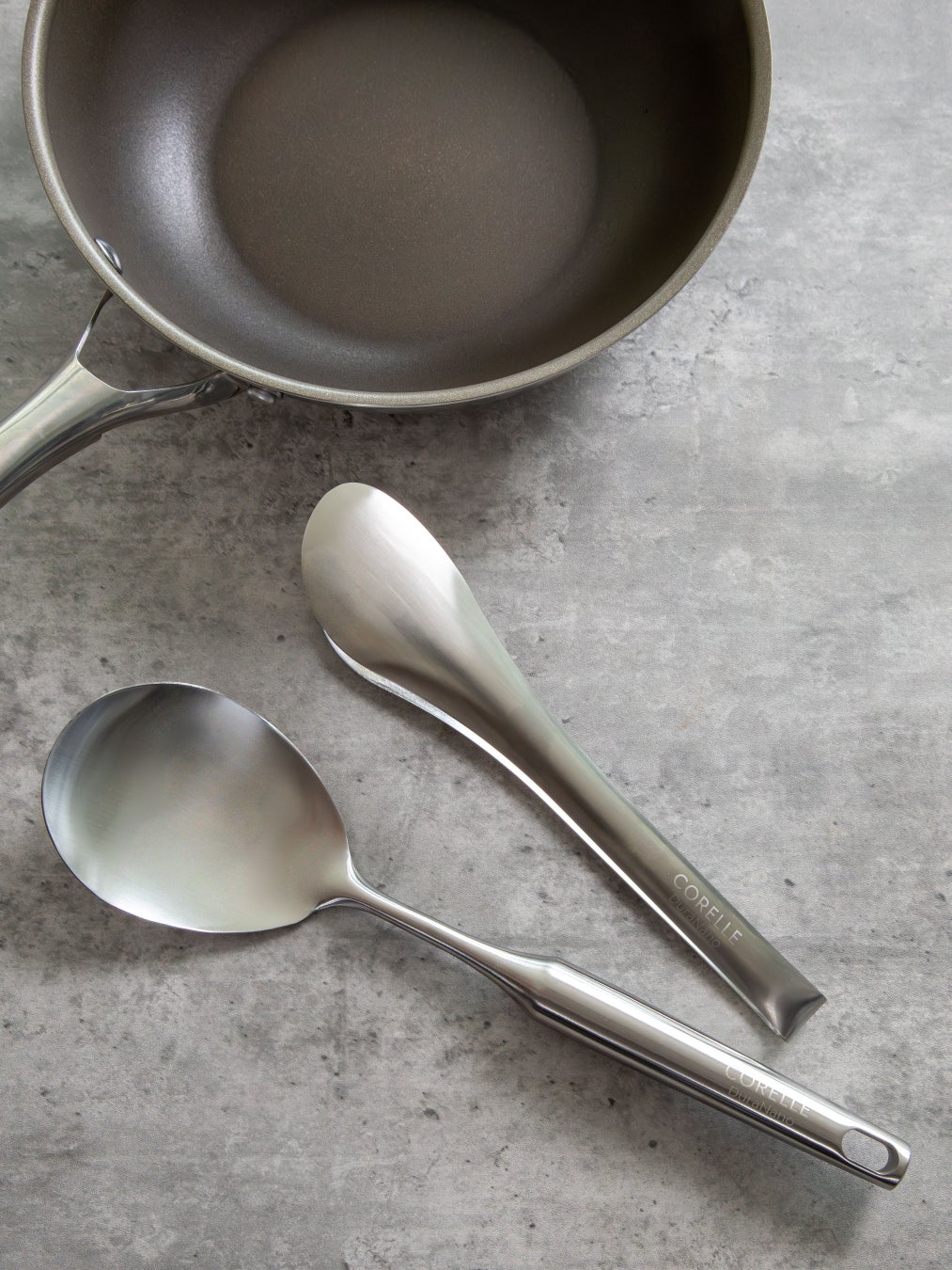 コレールフライパンと合わせて使うことを前提とした、スタイリッシュなデザインの万能調理スプーンとトングの2点セットです。調理から盛り付けまで、さまざまなシーンで活躍します。