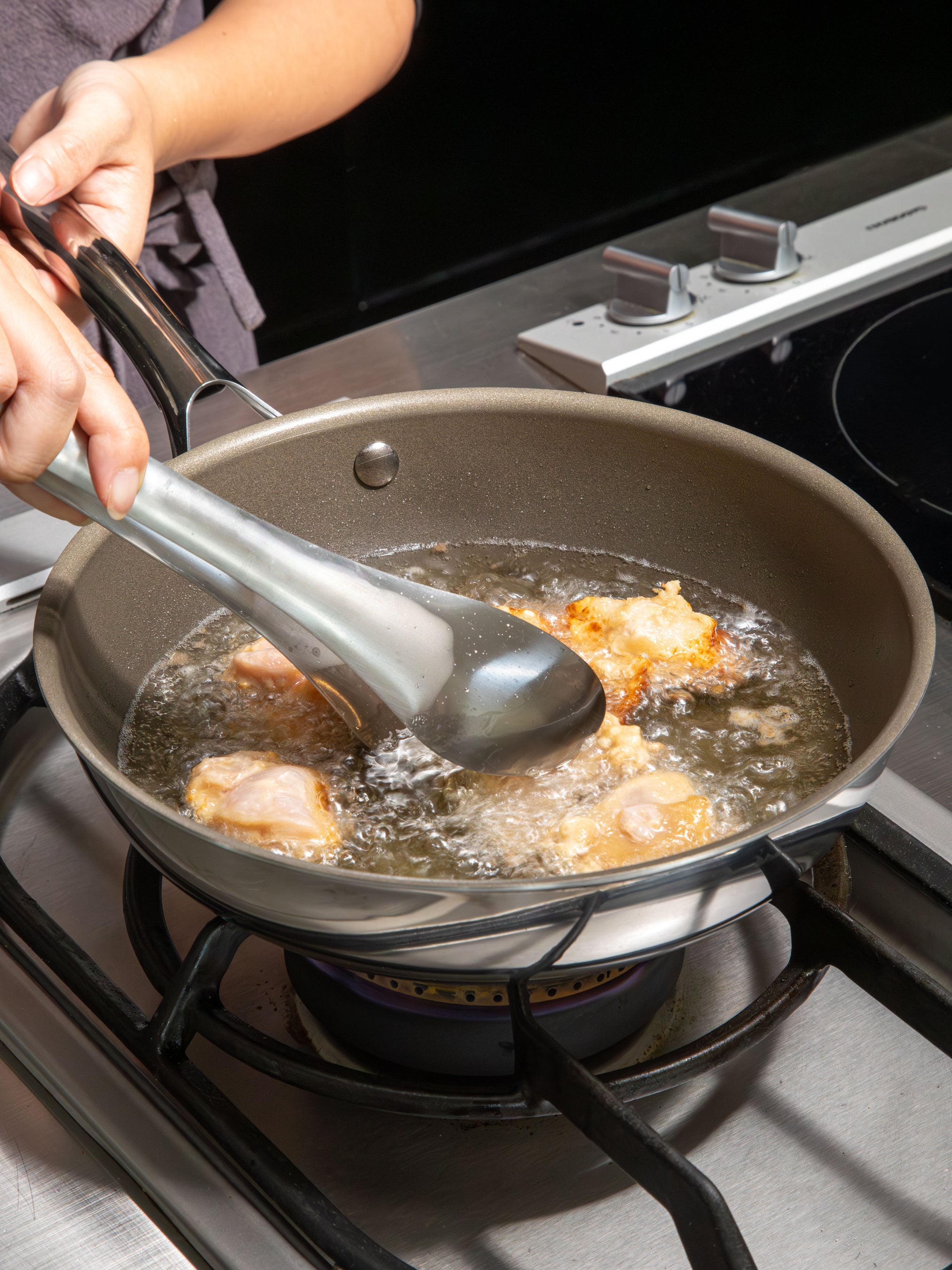万能調理スプーン、トングともに、フライパン本体のデザインに合わせた高級感のあるオールステンレス製のため、耐久性に優れ、高温調理も可能です。また、凹凸や継ぎ目のないシームレス形状のため、汚れがたまりにくく洗いやすい設計です。食洗機にも対応しているため、日々のお手入れも簡単です。