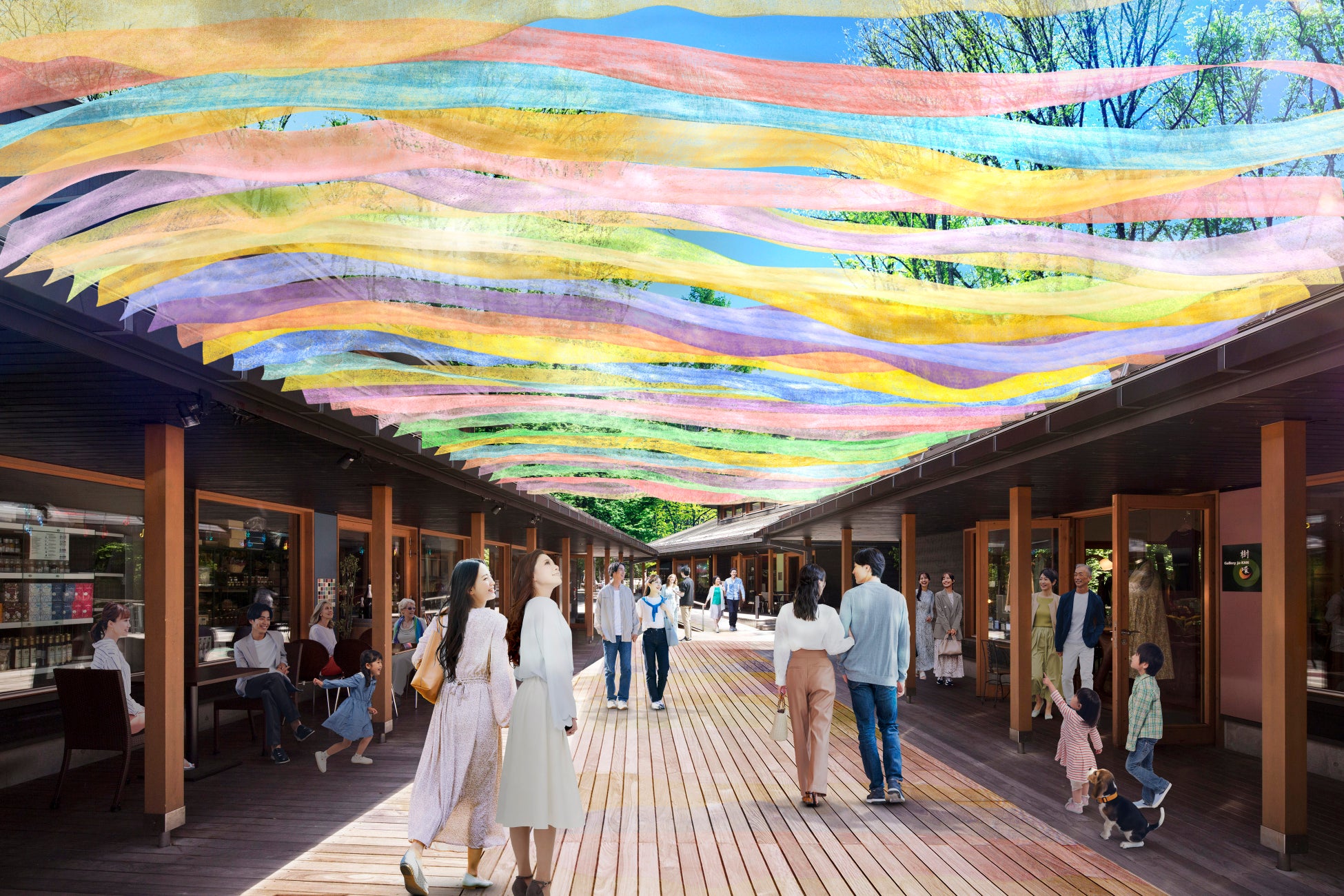 設置場所は、ハルニレテラスの入り口から続く店舗の軒先、丸山珈琲前のカフェスペース、ハルニレテラスから星野温泉 トンボの湯へとつながる遊歩道の3カ所。風に揺れるインスタレーションを眺めながら、買い物や食事を愉しむ空間を提供します。