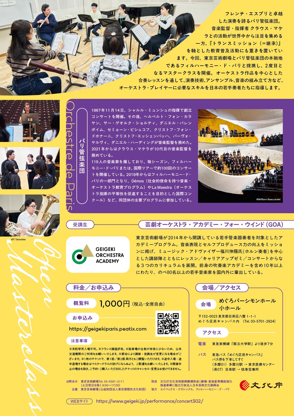 フレンチ・エスプリと卓越した演奏を誇るパリ管弦楽団。音楽監督・指揮者 クラウス・マケラとの活動が世界中から注目を集める一方、『トランスミッション(=継承)』を軸とした教育普及活動にも重きを置いています。今回、東京芸術劇場がパリ管弦楽団の本拠地であるフィルハーモニー・ド・パリと提携して、2度目となるマスタークラスを開催。受講生は芸劇オーケストラ・アカデミー・フォー・ウインド(GOA)のアカデミー生たち。オーケストラ作品を中心とした管楽器に特化した合奏形式のレッスンを通して、演奏技術、アンサンブル、音楽の組み立て方など、オーケストラ・プレイヤーに必要なスキルの指導を受けます。