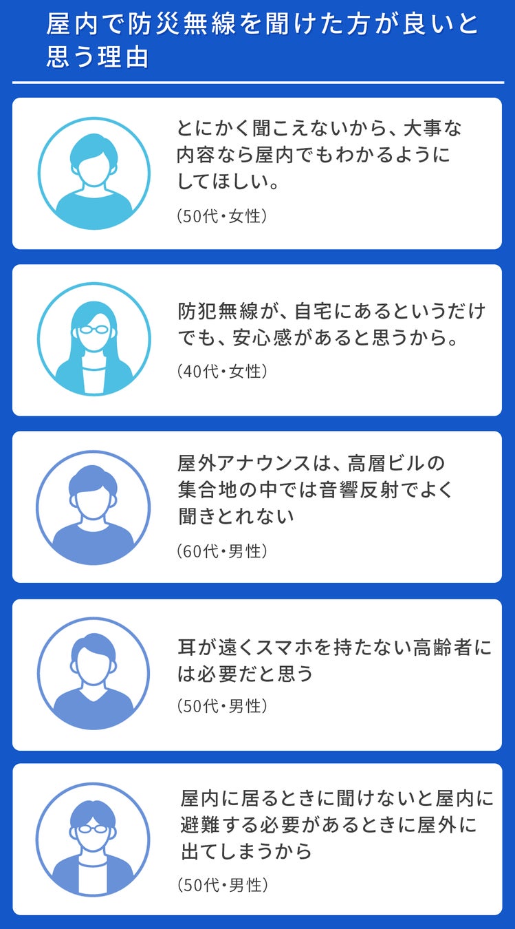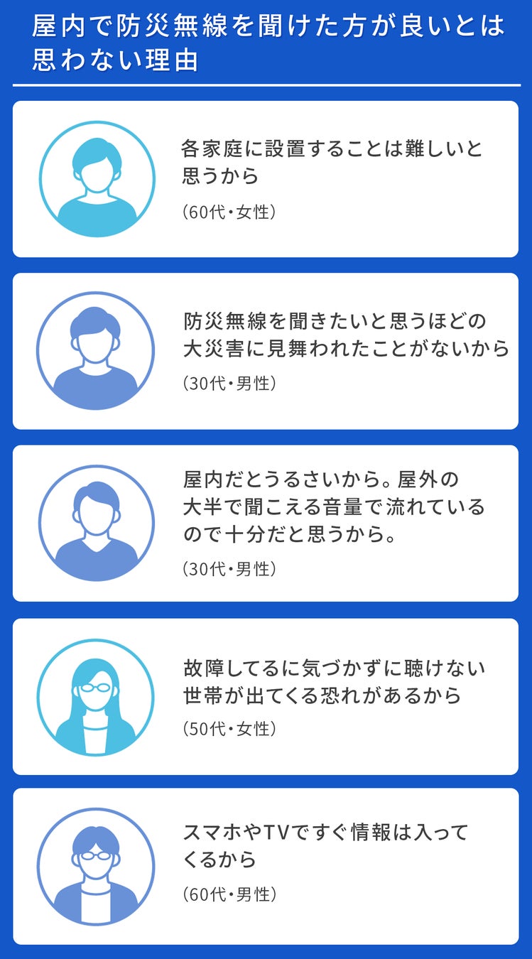 また、「屋内で防災無線を聞けた方が良いとは思わない」と回答した方の理由も紹介します。