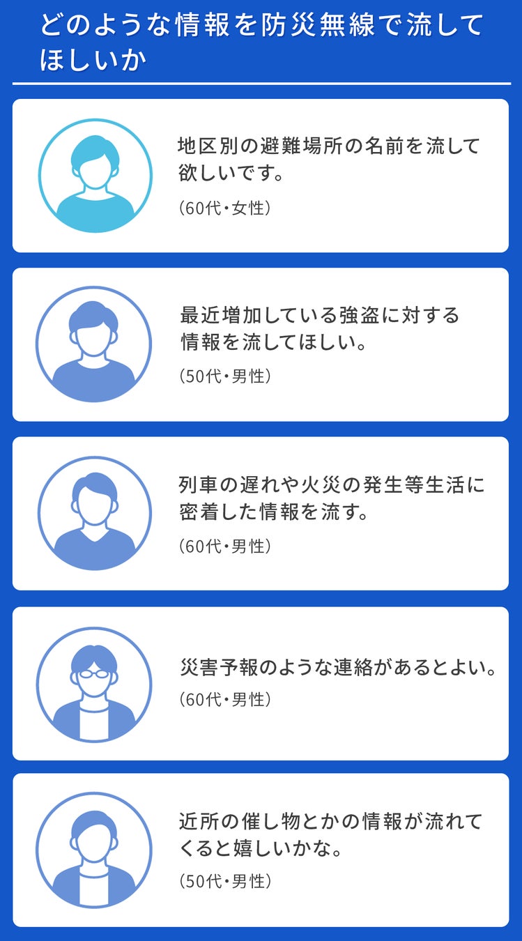 一方で、地域の催し物について放送して欲しいなど、生活に関わる情報があれば良いと思っている方もいました。
