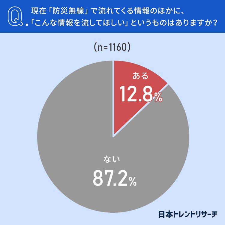 12.8%の方が、現在防災無線で流れてくる情報のほかに、『こんな情報を流してほしい』というものが「ある」と回答しました。