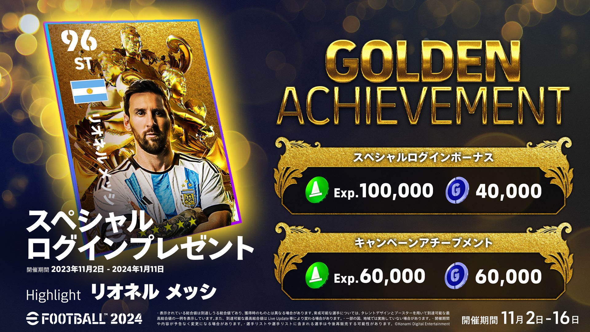 11月2日(木)~16日(木)の期間中、リオネル・メッシ選手を起用して、勝利を目指すイベント「Golden Achievement」を開催します。設定されたゴール数をクリアすることで、選手を育成できるアイテム「トレーニングプログラム」などが獲得できます!