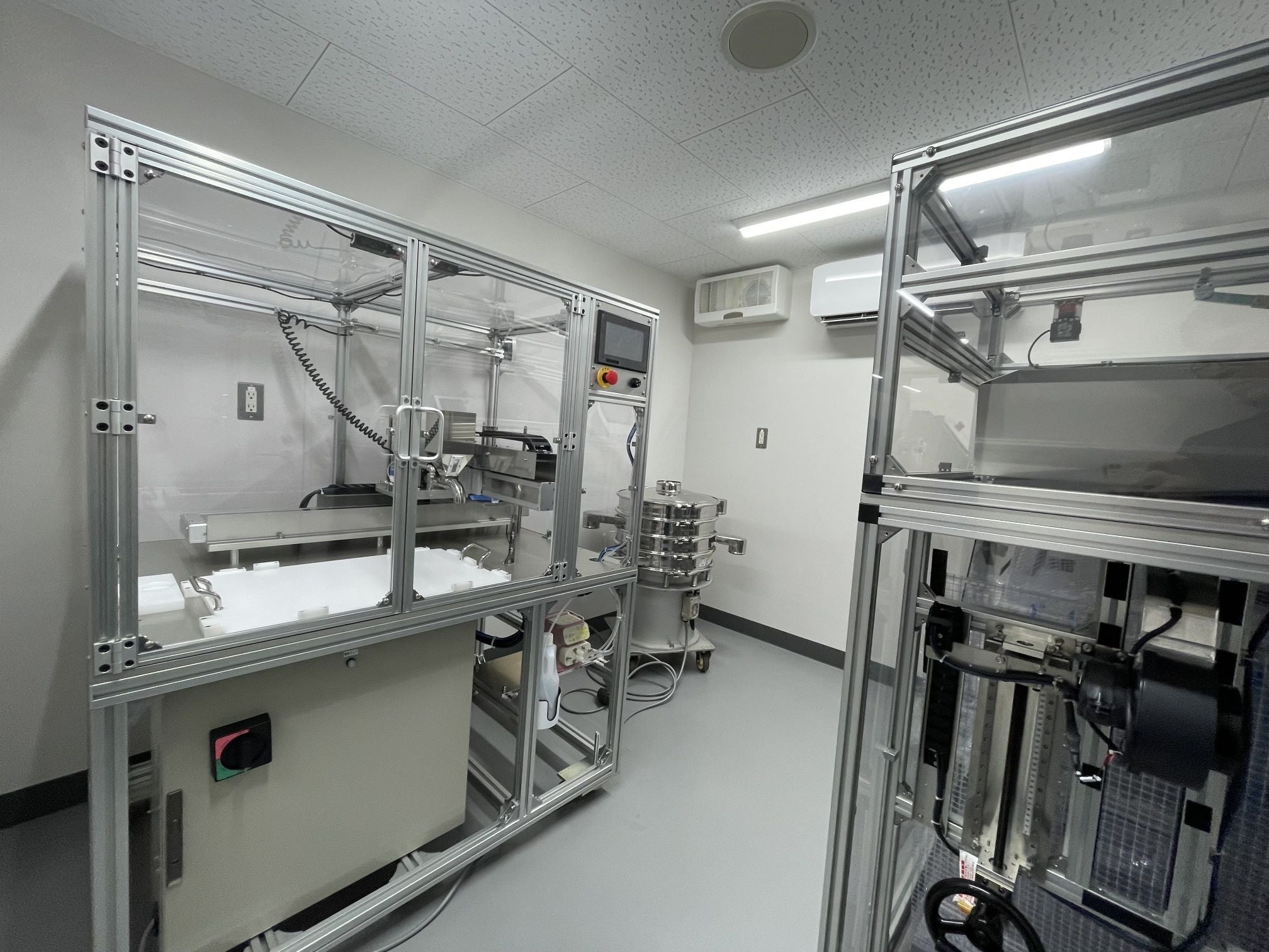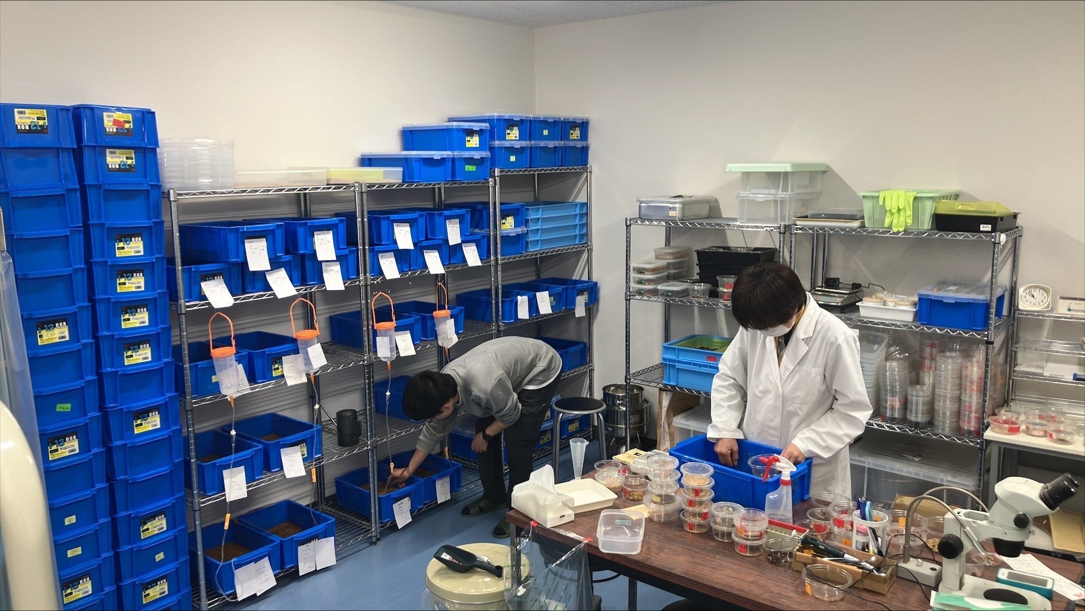 ○飼育・研究室と加工室の2部屋合計で100m2の広いスペースを運用
