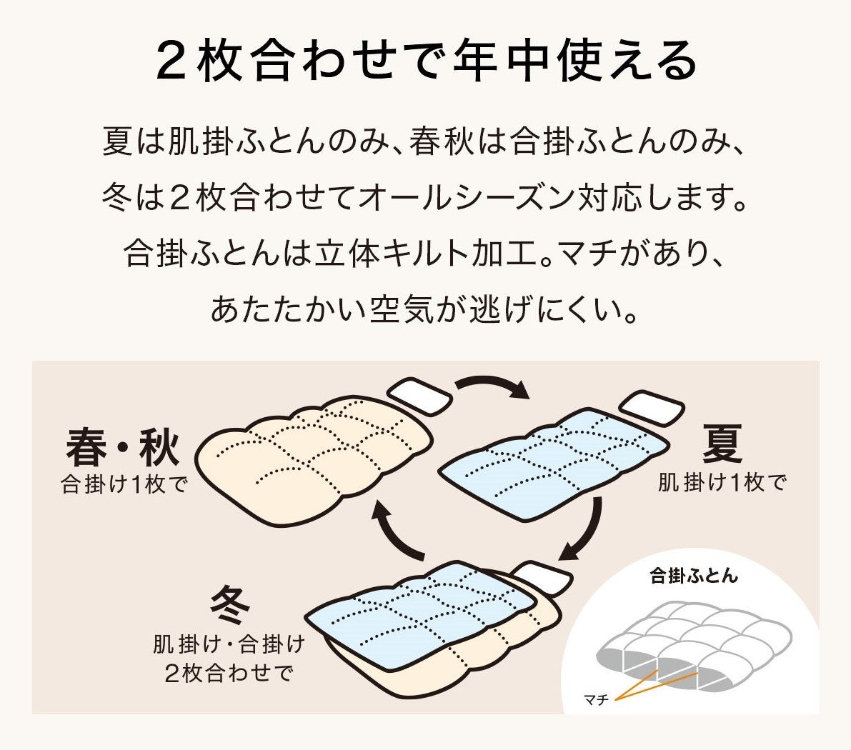 夏は肌掛けふとん1枚で、春秋は合い掛けふとん1枚で、冬は2枚合わせで、季節によって使い分けが可能となります。