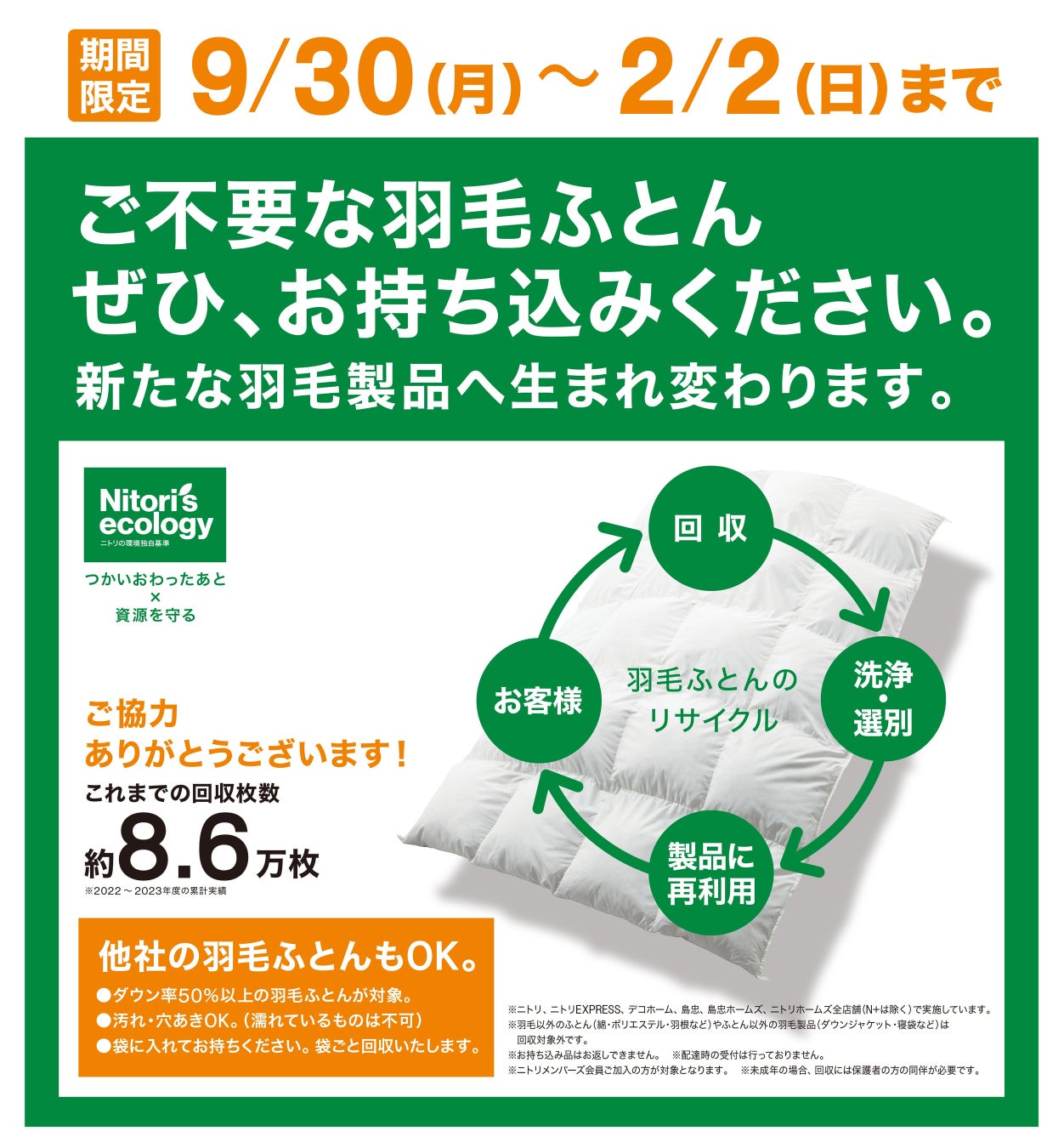 ニトリグループでは2024年9月30日(月)~2025年2月2日(日)の期間限定で、羽毛布団のリサイクル回収を実施いたします。ニトリ以外の羽毛布団でもOKです!10年、20年前のものでも問題ございません。お手元で処分を検討されている羽毛布団がございましたら、ぜひお近くの店舗にお持ち込みください。