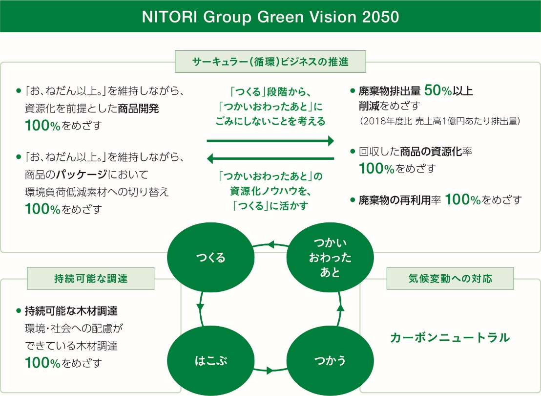 私たちニトリグループは「住まいの豊かさを世界の人々に提供する。」というロマン(志)を掲げ、その実現に向け歩みを進めております。ニトリグループ独自の「つくる」「はこぶ」「つかう」「つかいおわったあと」という循環型ビジネスモデルを最大限活かし、持続可能な「住まいの豊かさ」実現に貢献するため、2050年に向けた目標である「NITORI Group Green Vision 2050」を策定。その中では、サーキュラー(循環)ビジネスの推進の一環として、「お、ねだん以上。を維持しながら、資源化を前提とした商品開発100%をめざす」「回収した商品の資源化率100%をめざす」という目標を掲げています。お客様より回収した大切な資源を循環させ、今回の再生羽毛布団の取り組みのように商品開発に活かしていくことで、今後もお客様とともに持続可能な未来を目指してまいります。