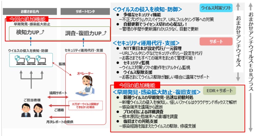 ■また、同日より、法人向けクラウド型ウイルス対策サービス「おまかせアンチウイルス」へ、マルウェア侵入後の「早期発見」「感染拡大防止」「復旧支援」を実現するEDR※2機能とこれらを一元的にサポートデスクにてフォローする機能を具備した「おまかせアンチウイルスEDRプラス」を提供いたします。